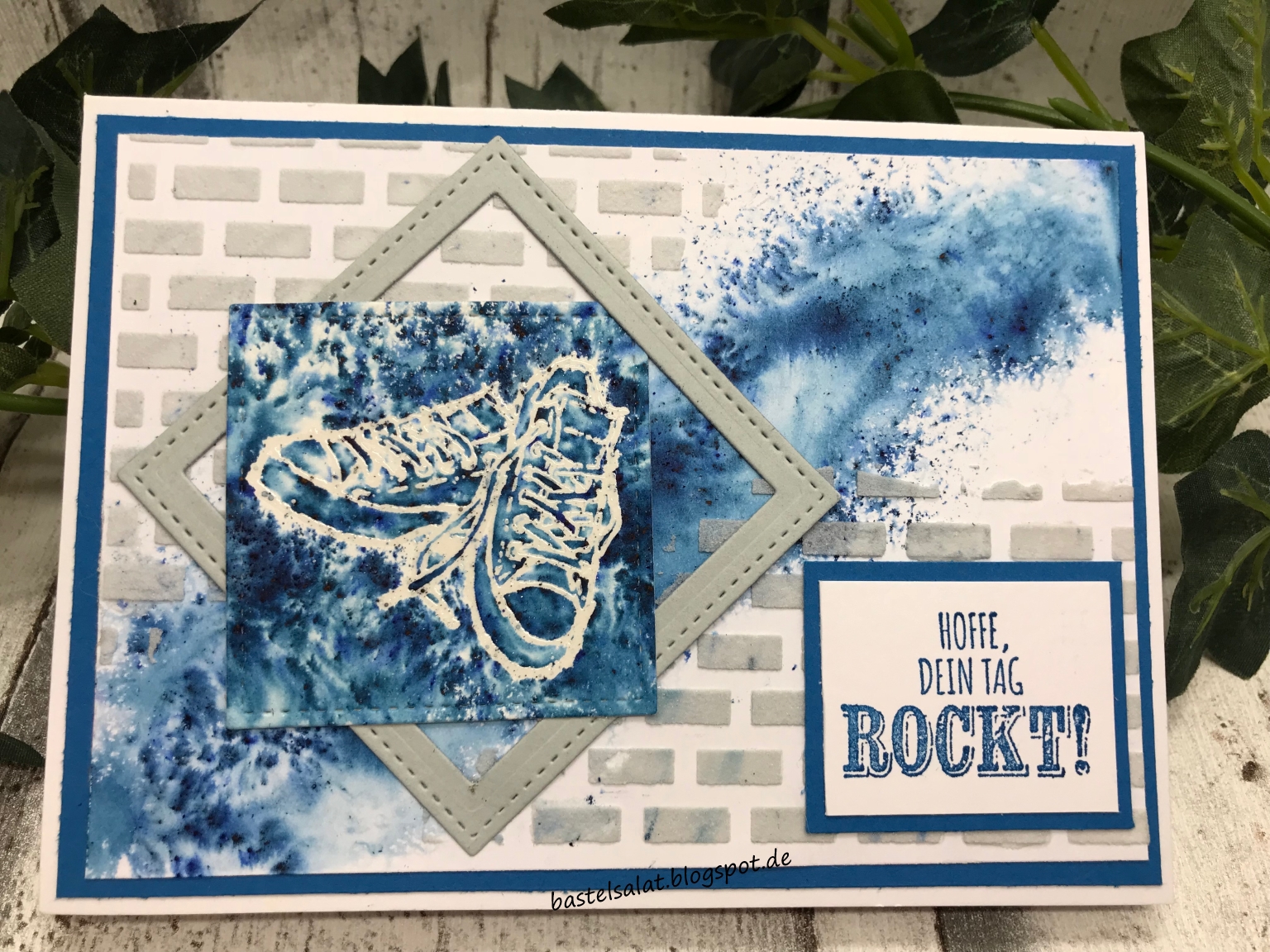 WĂ€hrend der Cardstock nun erst einmal trocknen musste, habe ich dann schon einmal die Turnschuhe aus dem SAB Set „Echt Cool“ in „Klar embosst und anschlieĂend ebenfalls mit Brusho bearbeitet.