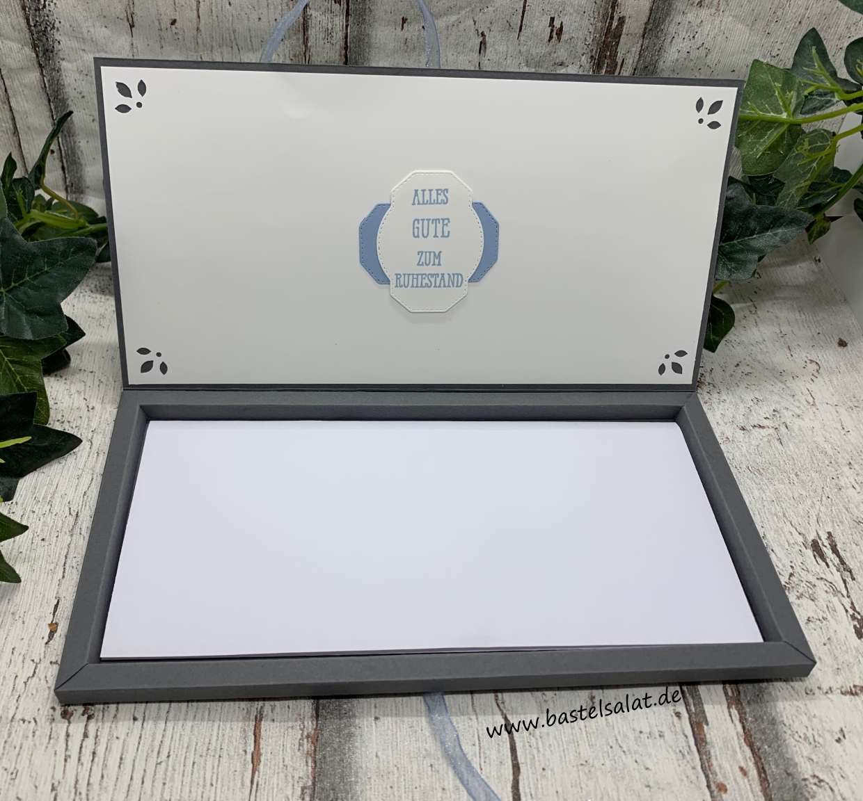 Diese Gutscheinverpackung habe ich in Auftragsarbeit für eine Kundin – Kollege geht in Ruhestand, bekommt zum Abschied einen Gutschein (DIN lang) geschenkt und es muss genug Platz für mindestens 20 Unterschriften sein – gewerkelt.