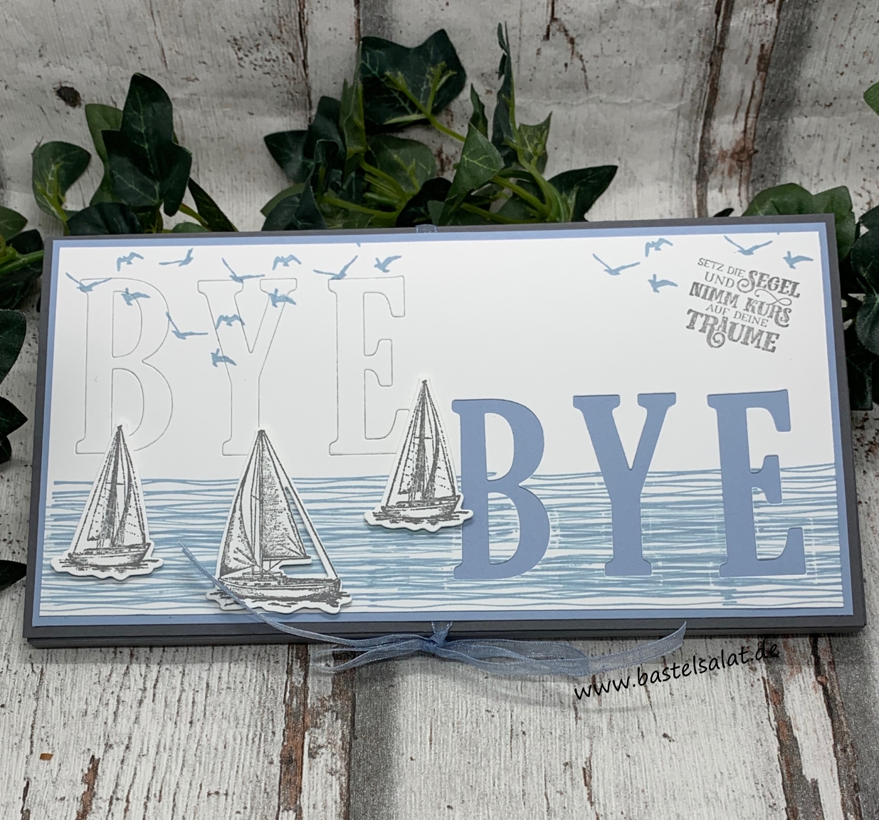 Bevor mit den Stanzformen Große Buchstaben (gibt es leider nicht mehr) das Bye Bye aus dem Flüsterweißen Cardstock gestanzt wurde, ist dieser zuerst mit Stempeln aus den Sets „Setzt die Segel“ und „Am Seerosenteich“ bestempelt worden.