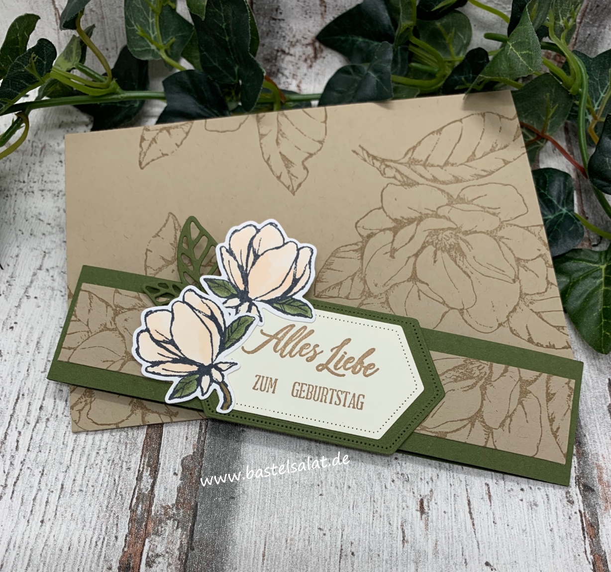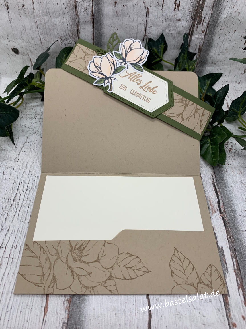 Bei diesen Gutscheinverpackungen habe ich die Farben Savanne, Waldmoos und Vanillepur mit einander kombiniert und mit dem tollen Produktpaket „Magnoliengruß“ gearbeitet.
