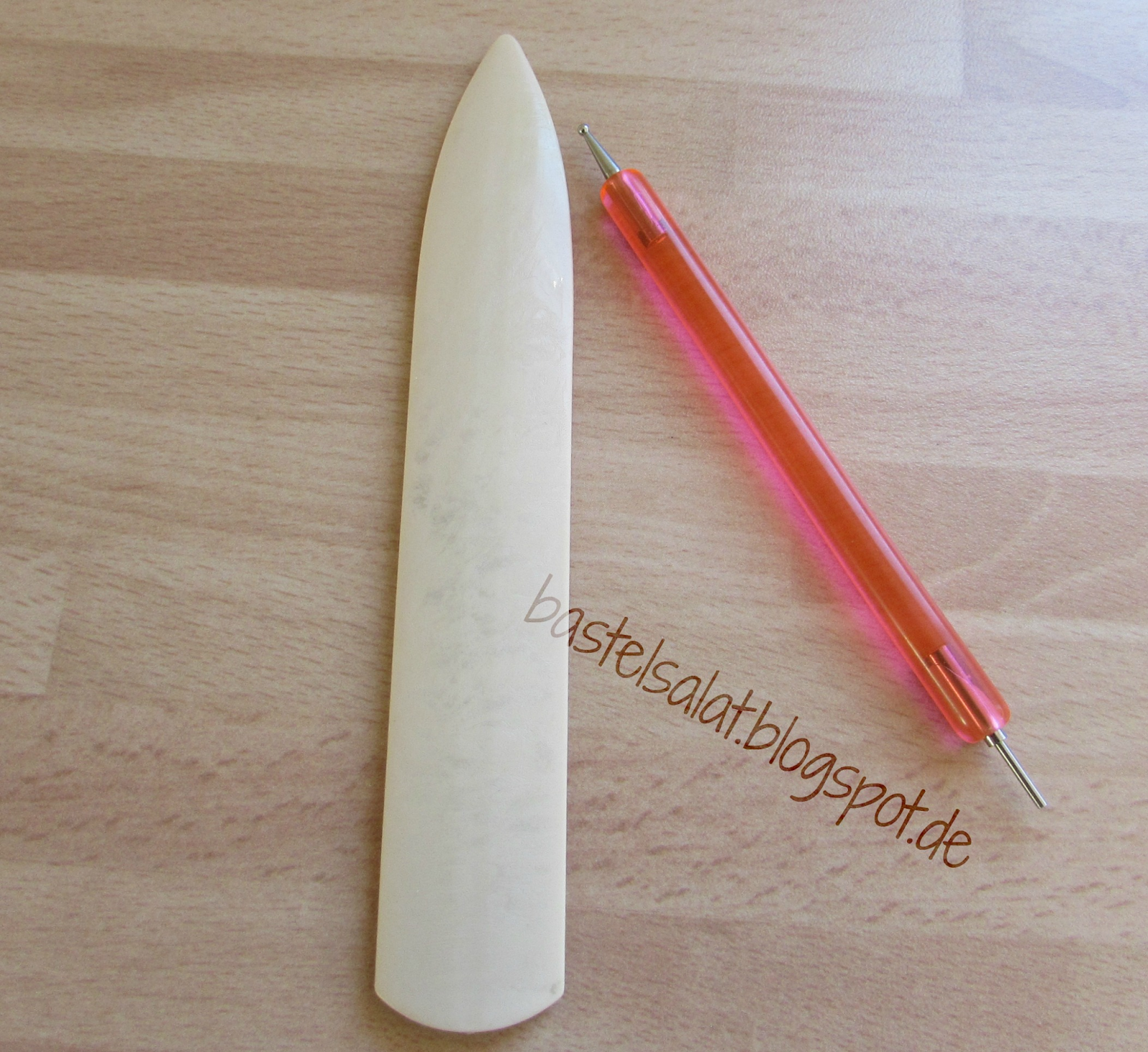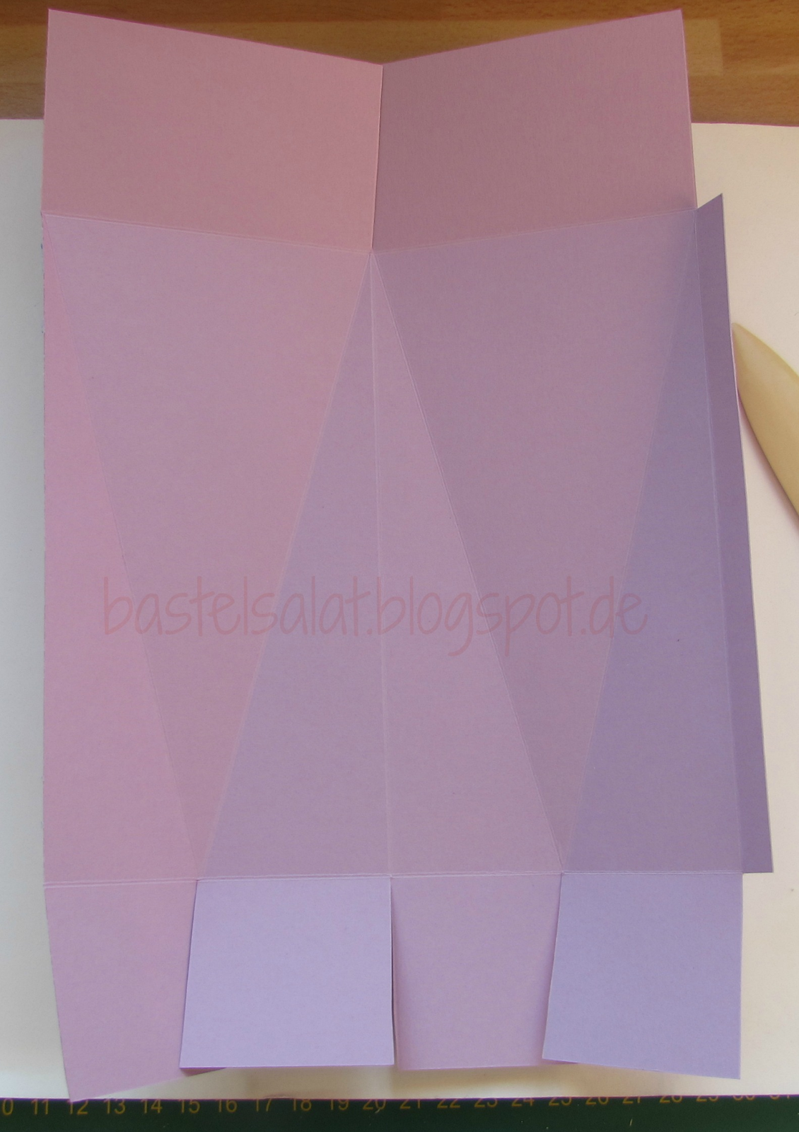 Nun müssen noch die wichtigsten Falzungen gemacht werden, damit die Box sich schön „aufbläht“. Um diese, diagonal verlaufenden Falzungen, zu erhalten, arbeitet man am besten mit Lineal und einem Prägestift oder Falzbein.