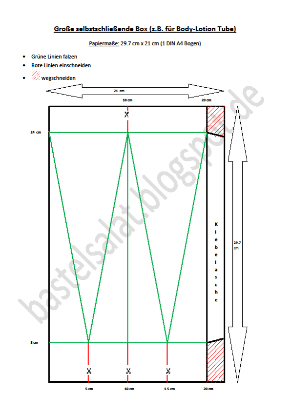 • Die Bodenlaschen werden bei 5 cm und 15 cm gefalzt (! nur bis zur ersten Querfalz!)