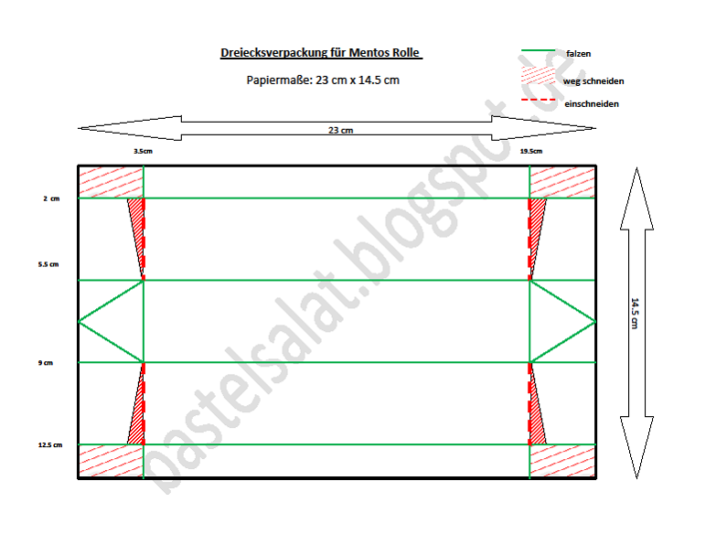 Beim stöbern im WWW bin ich auf einige Dreiecksverpackungen für Mini Mentos etc. gestoßen. Da mir diese richtig gut gefallen, habe ich mich hingesetzt, die Maße für eine große Mentos Rolle berechnet, ein klein wenig noch herum getüftelt und „tada“, es hat geklappt 😇.