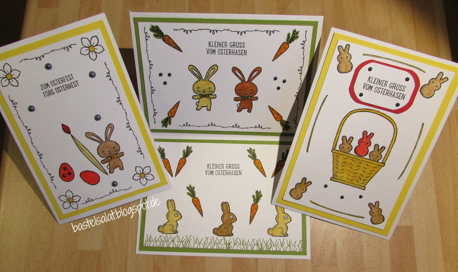 Welche Karte ist euer Favorit? Mir gefallen alle sehr gut, aber ich muss gestehen, der kleine Hase mit seinem Pinsel hat es mir am meisten angetan đ.