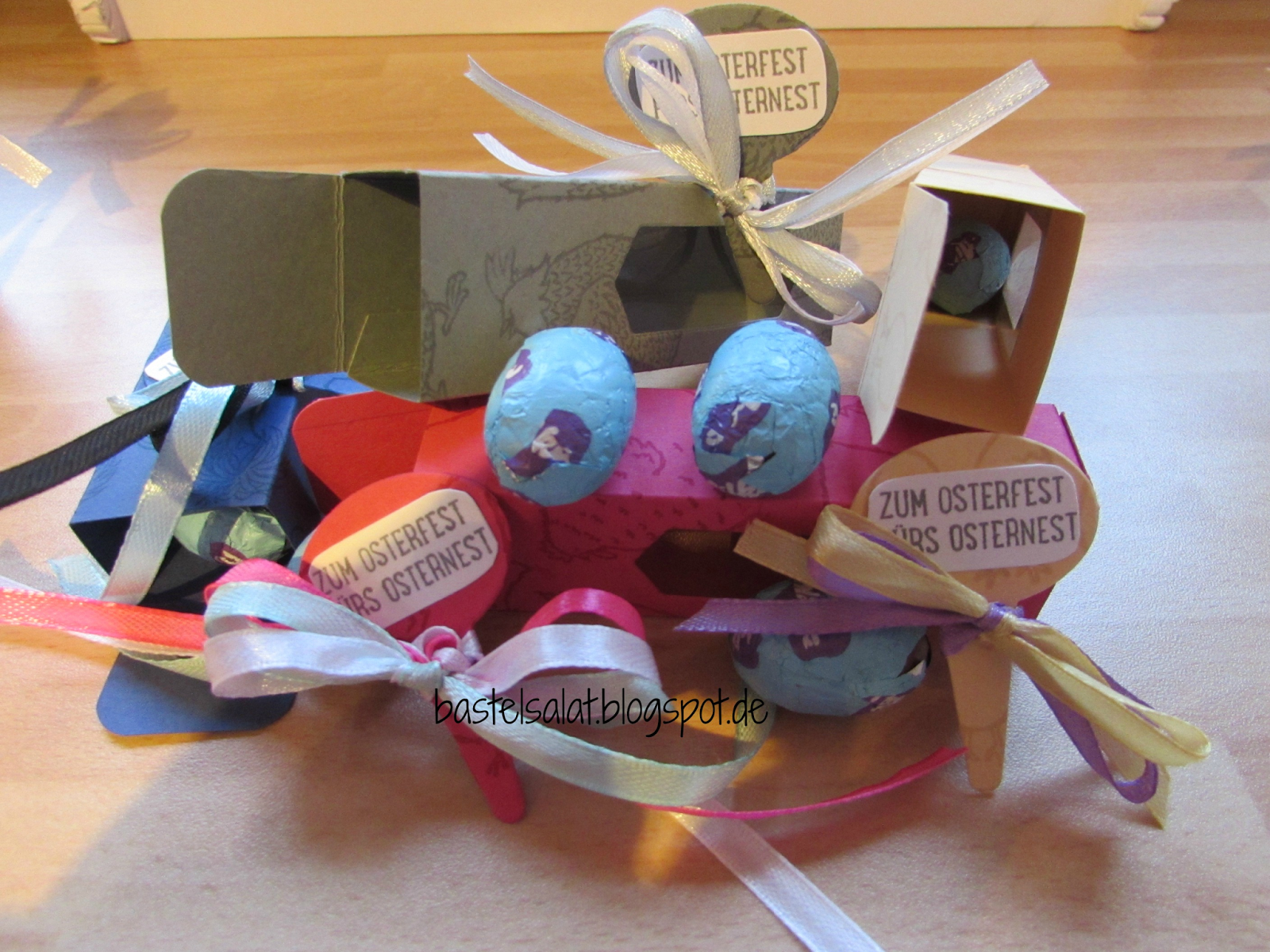 An dieser habe ich mich orientiert, die MaĂe passend, fĂŒr meine kleinen Schoki-Eier, umgerechnet und noch ein Sichtfenster hinein gemacht. Ich glaube das Endresultat kann sich sehen lassen, oder?