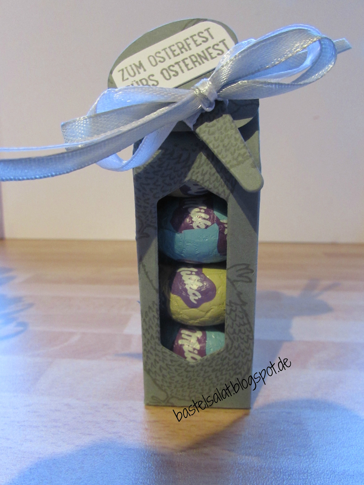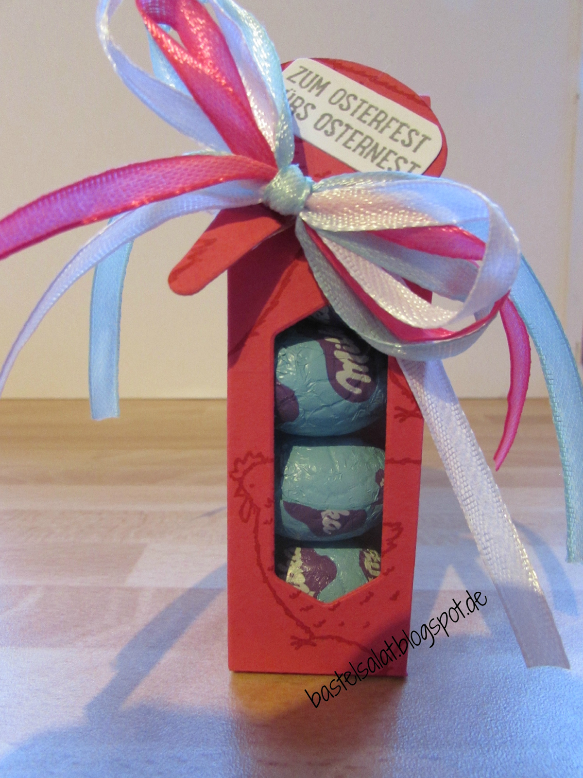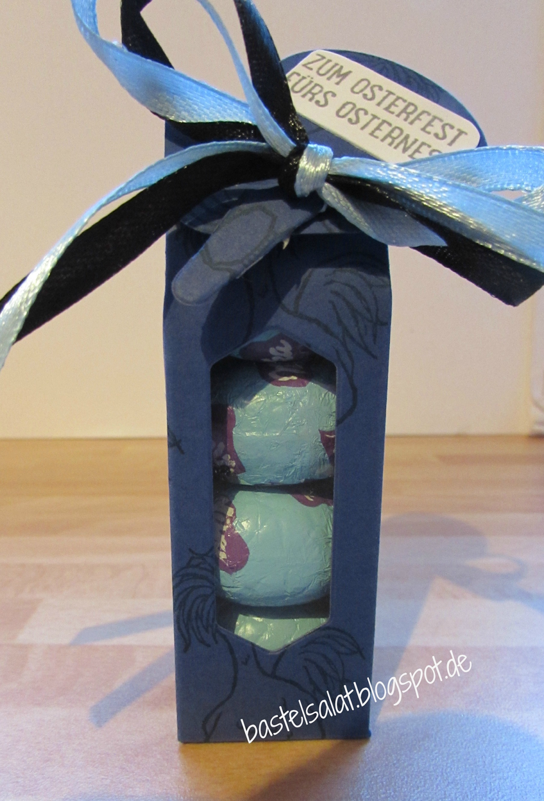 An dieser habe ich mich orientiert, die MaĂe passend, fĂŒr meine kleinen Schoki-Eier, umgerechnet und noch ein Sichtfenster hinein gemacht. Ich glaube das Endresultat kann sich sehen lassen, oder?