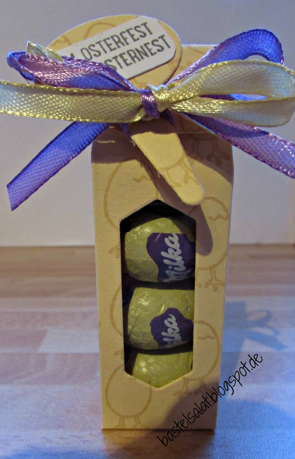 Heute habe ich eine „Kleine GeschenktĂŒte“ mit Sichtfenster, fĂŒr 4 kleine Milka Eier, gewerkelt.