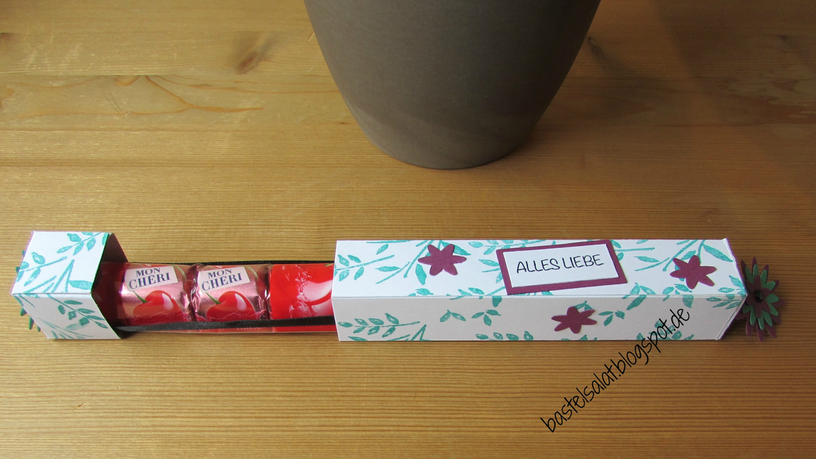 Die fertige Verpackung ist ein „Schokoladenaufzug“ geworden. Der verwendete Schriftzug stammt aus dem Stempelset „Bäumchen schüttel dich“.