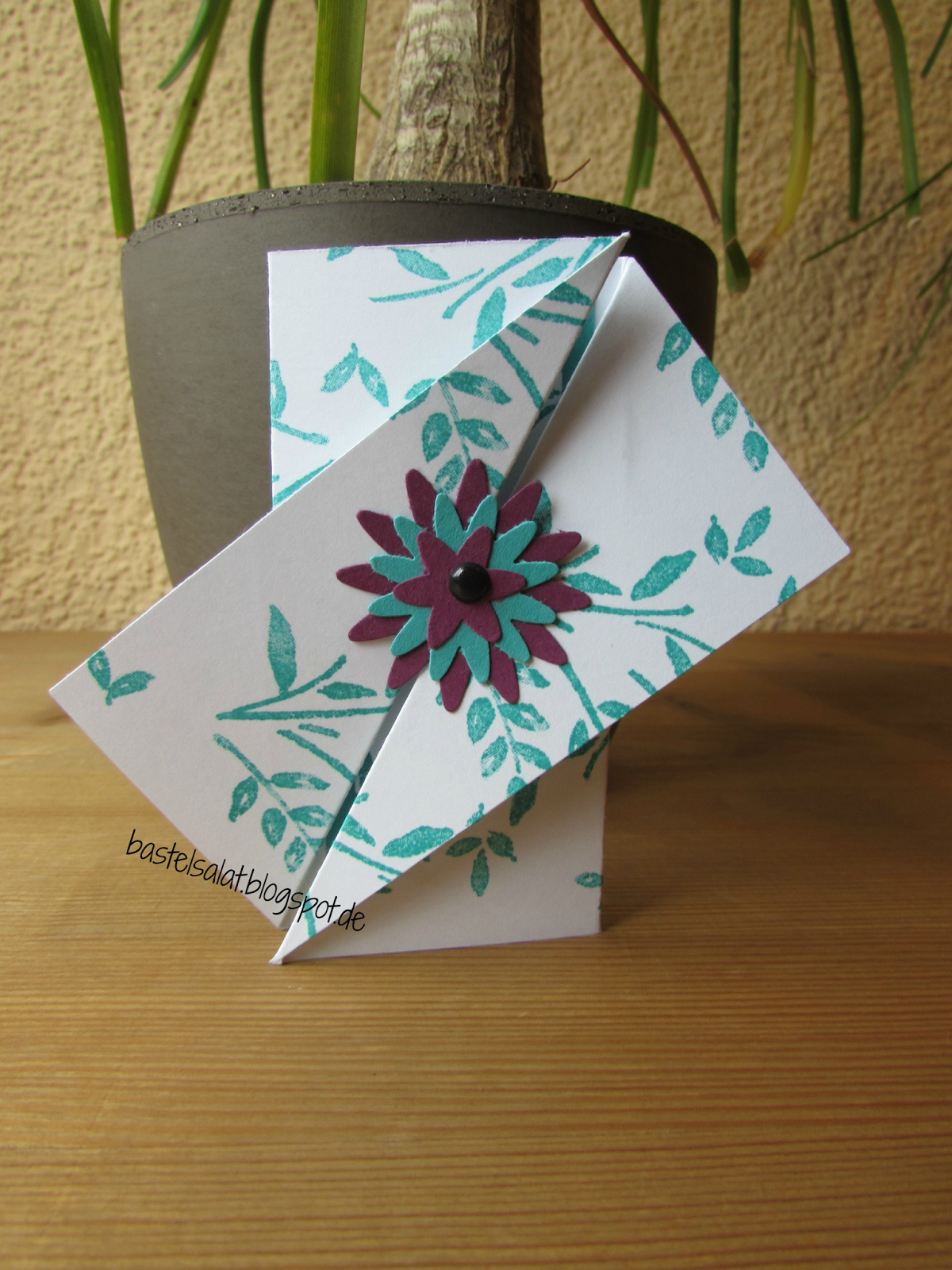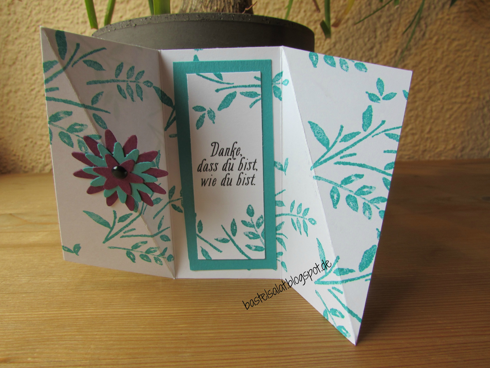 Bei der Kartengröße von 15 cm x 10 cm eignet sich eine, mit der Stanze „Dreierlei Blüten“, ausgestanzte Blüte, prima als Verschluss.