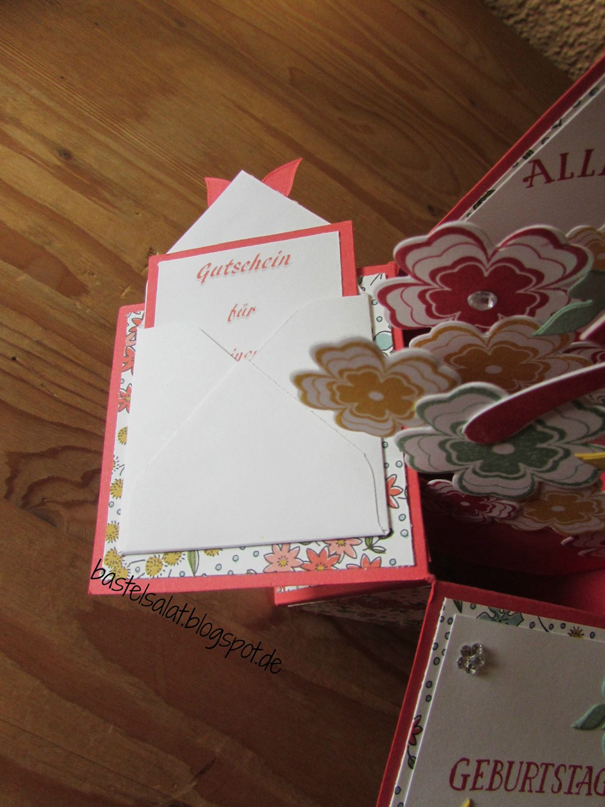 Den gewünschte Gutschein habe ich am PC geschrieben, auf ein Stück Cardstock in „Melonensorbet“ geklebt und in einen kleinen Umschlag, der prima auf eine Faltseite passt, gesteckt.