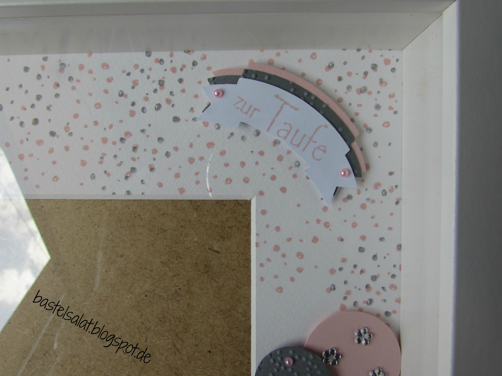 Die beiden anthrazitgrauen Zier-Etiketten habe ich unter das weiße Zier-Etikett, auf dem der Name des Taufkindes steht, geklebt. Ich finde das es ein bisschen aussieht wie eine Wolke, oder?