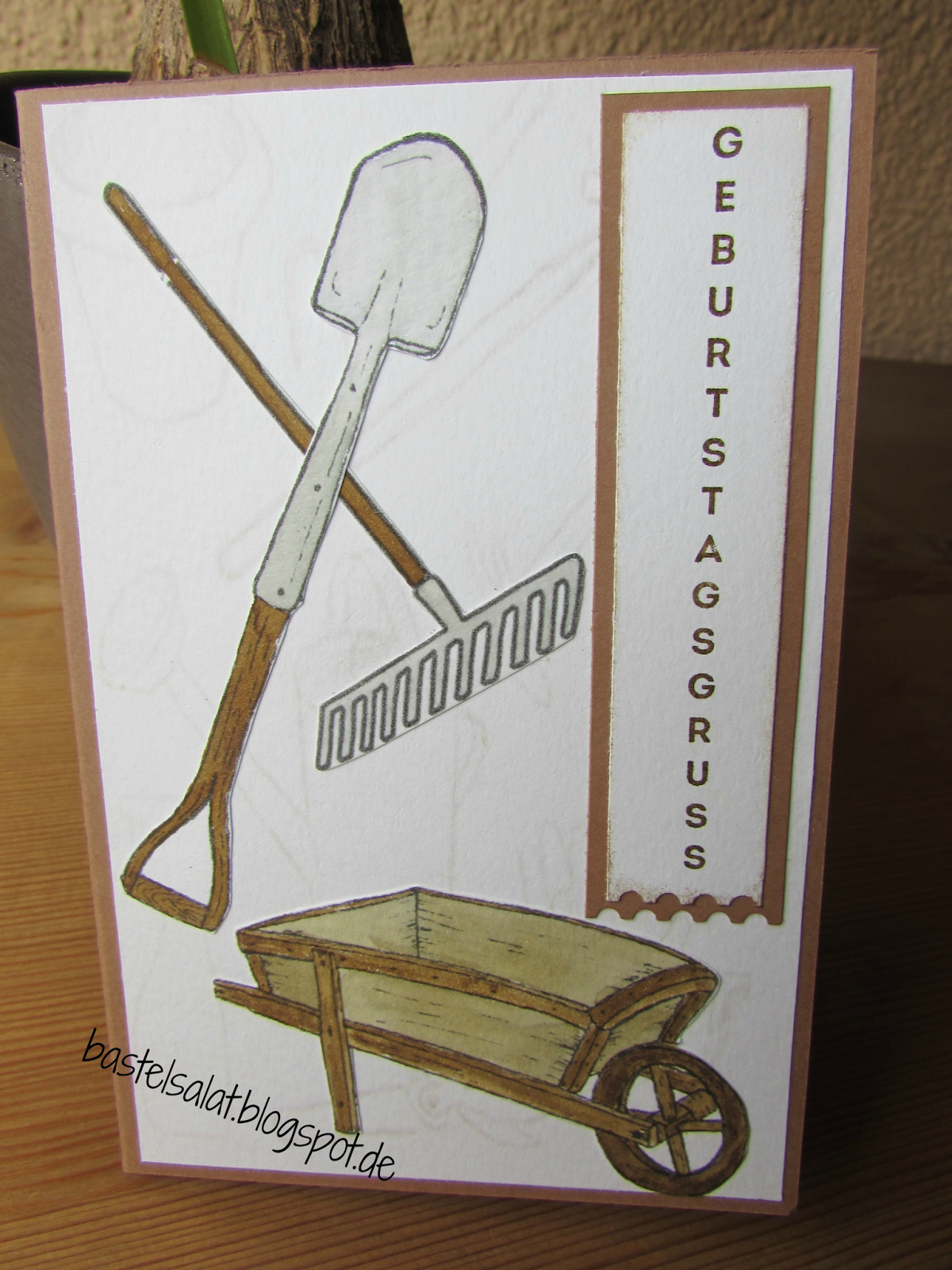 Zum colorieren von Spaten, Rechen und Schubkarre habe ich die Farben „Wildleder“, „Savanne“ und „Schiefergrau“ verwendet.