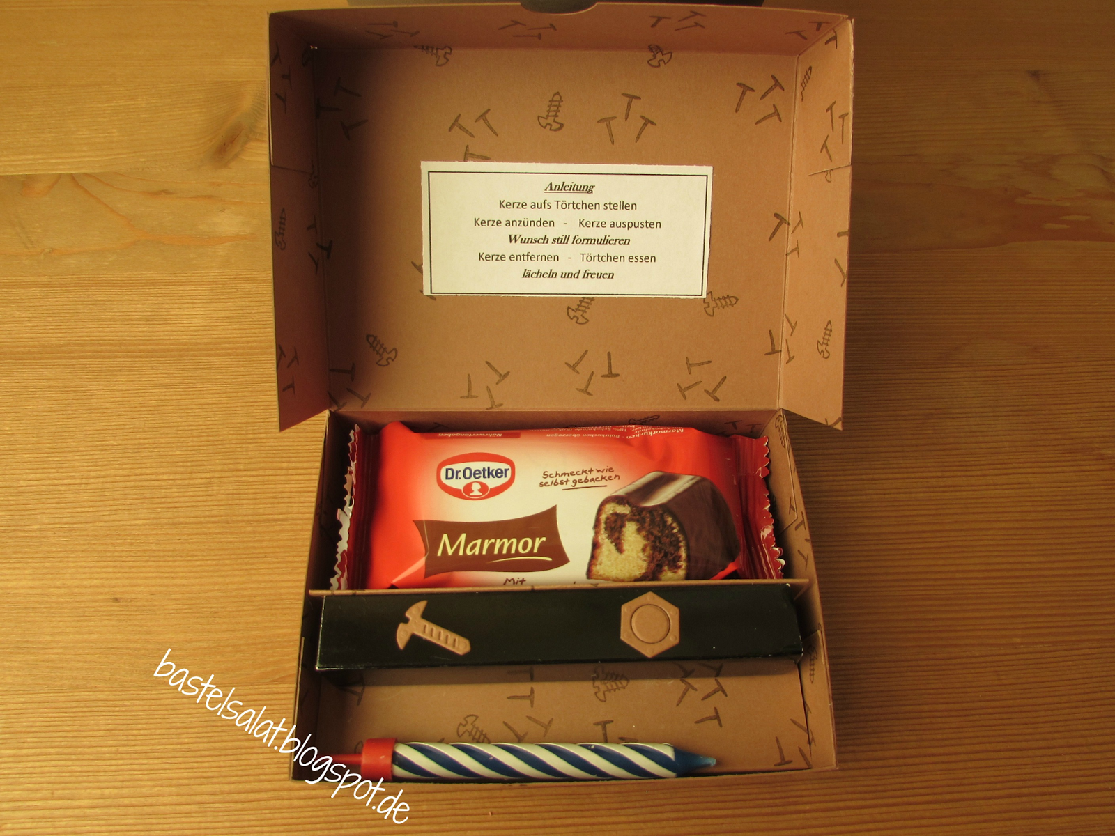 Im Inneren befindet sich ein kleiner Kuchen, Streichhölzer, eine Geburtstagskerze, sowie die Anleitung.