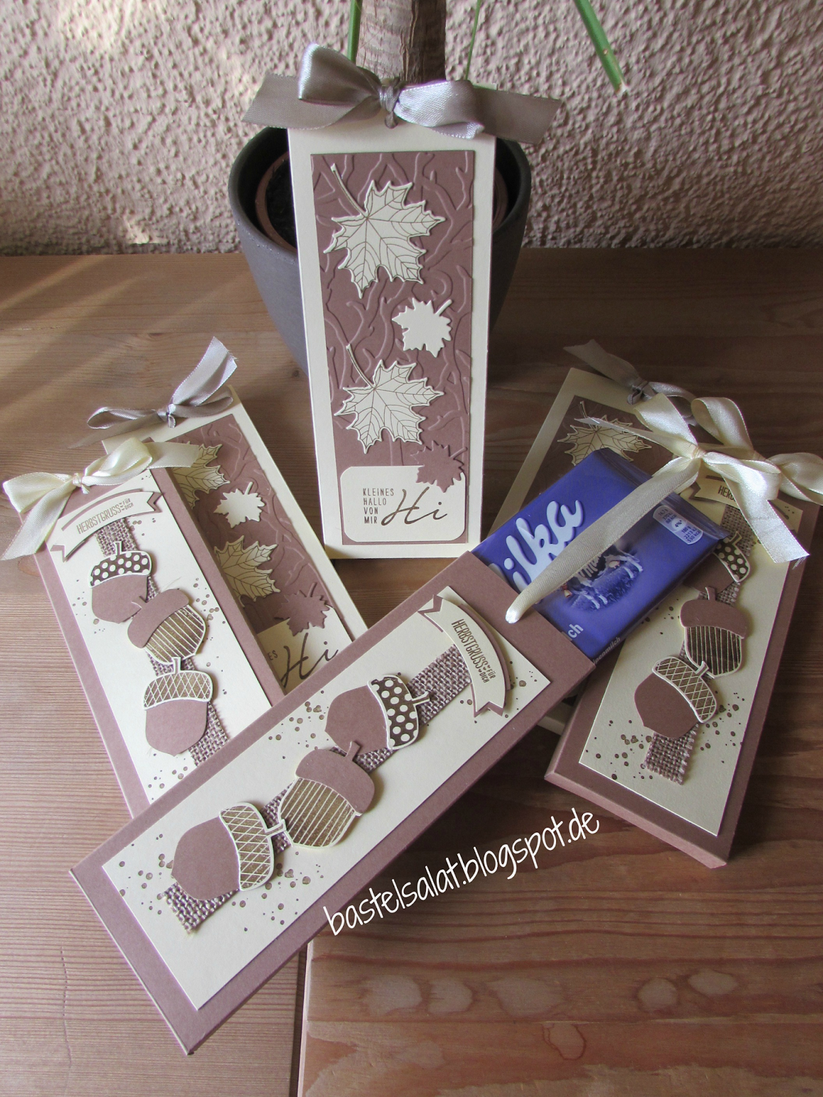 Bei der 1 Variante kamen die Stempelset’s „Alles Palette“ und „Herbstgrüße, sowie die Eichelstanze zum Einsatz. Die ausgestanzten Eicheln sind mit einem Juteband unterlegt.