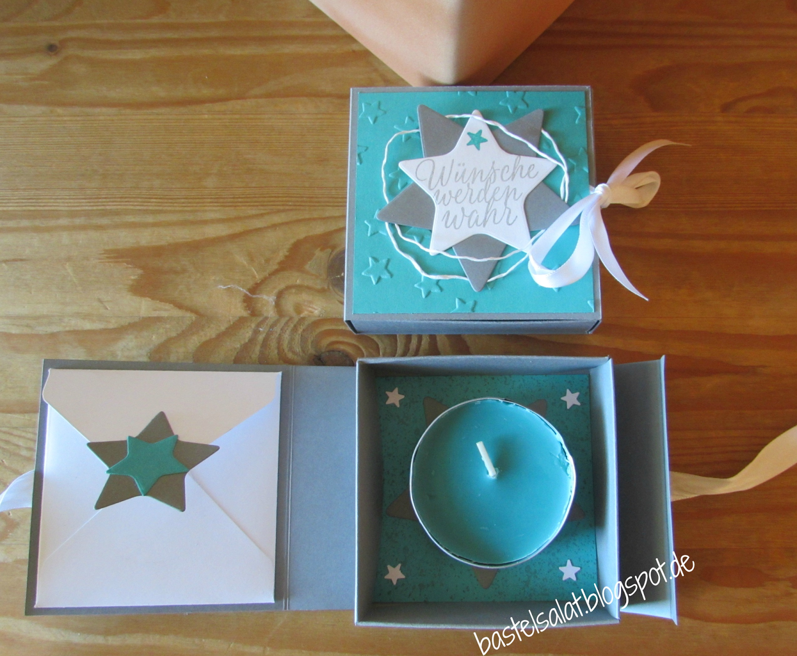 | Schiefergrau, Flüsterweiß, Bermudablau, Prägefolder „Glückssterne“, Stempelset’s „Drauf und Dran“ + Touches of Textures |