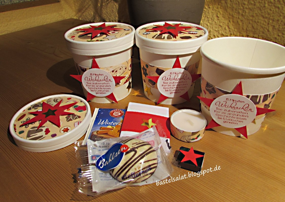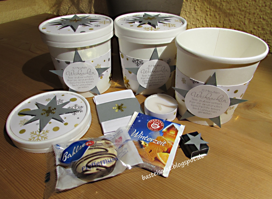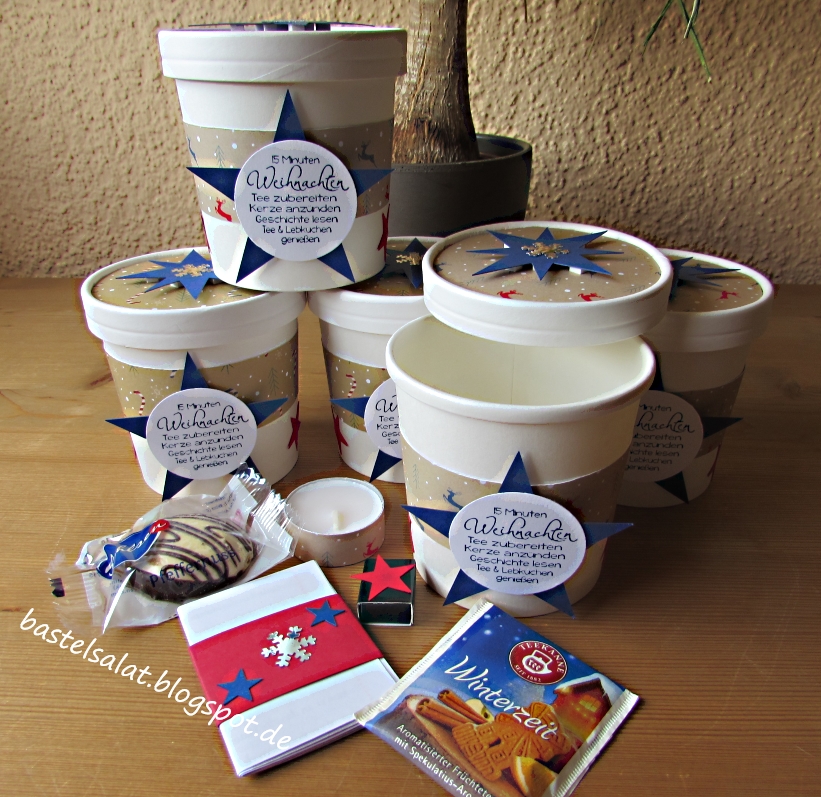 Gefüllt sind diese Becher jeweils mit Lebkuchen, einem Wintertee, einem Teelicht, Streichhölzern und einer weihnachtlichen Geschichte.