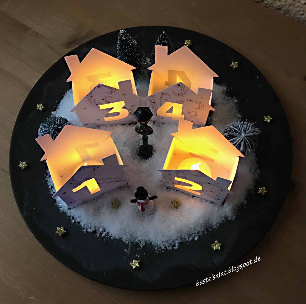 Auf Kunstschnee gebettet, mit ein paar kleinen Tannen, einer Laterne und einem Schneemann bestückt ist zum guten Schluss aus dem Adventskranz ein kleines, süßes Winterdörfchen entstanden.