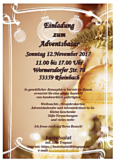 Ihr wundert euch bestimmt das ich in der letzten Zeit ziemlich wenig gepostet habe, aber am Sonntag, 12.11.17, steht mein Adventsbasar, bei mir zu Hause an und ich bin noch fleißig dafür am werkeln.