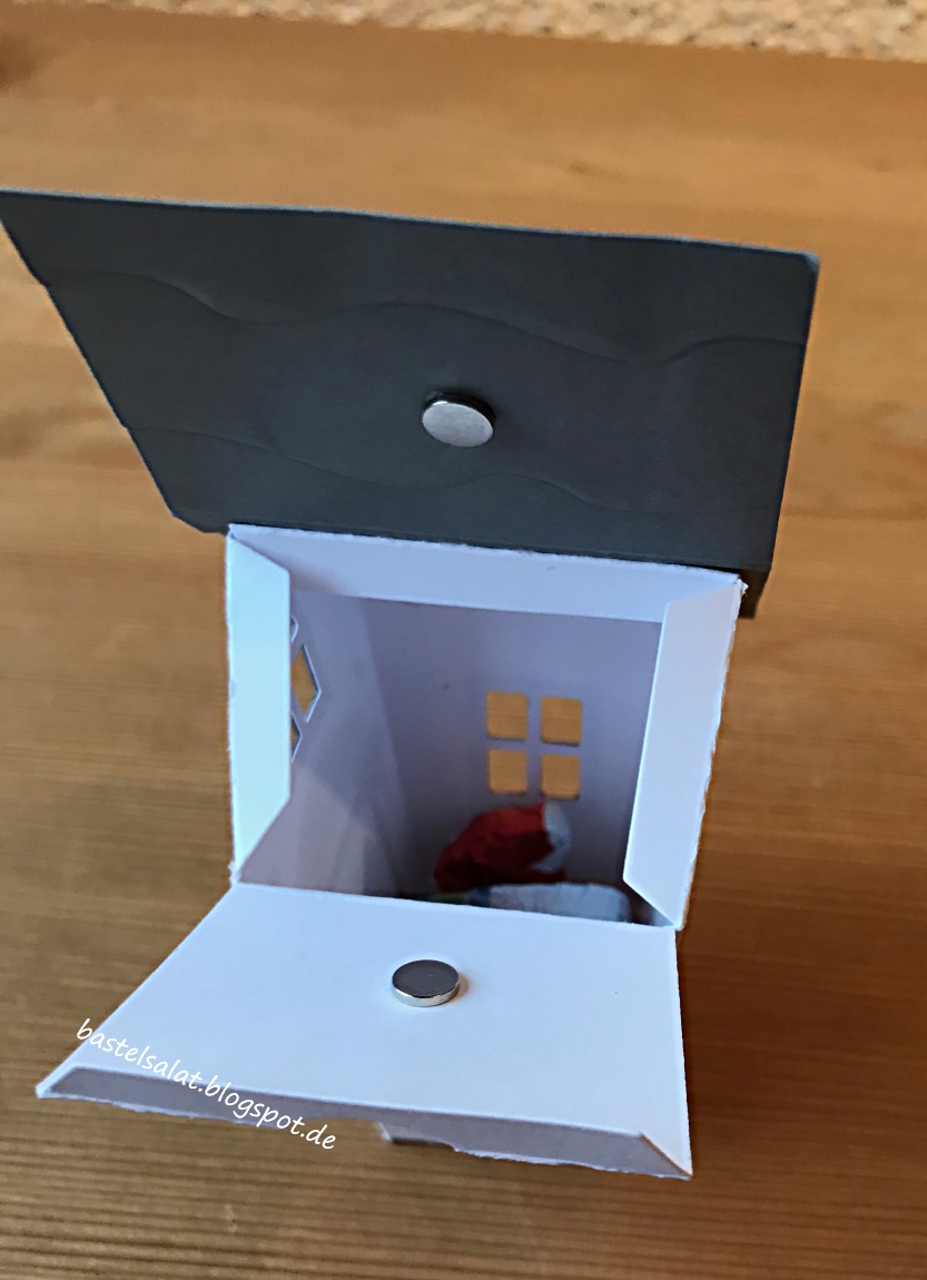 Damit man das Haus gut befüllen kann und es beim Öffnen nicht zerstört wird, habe ich das Dach nur an einer Seite festgeklebt und an der anderen Seite einen Magneten angebracht.