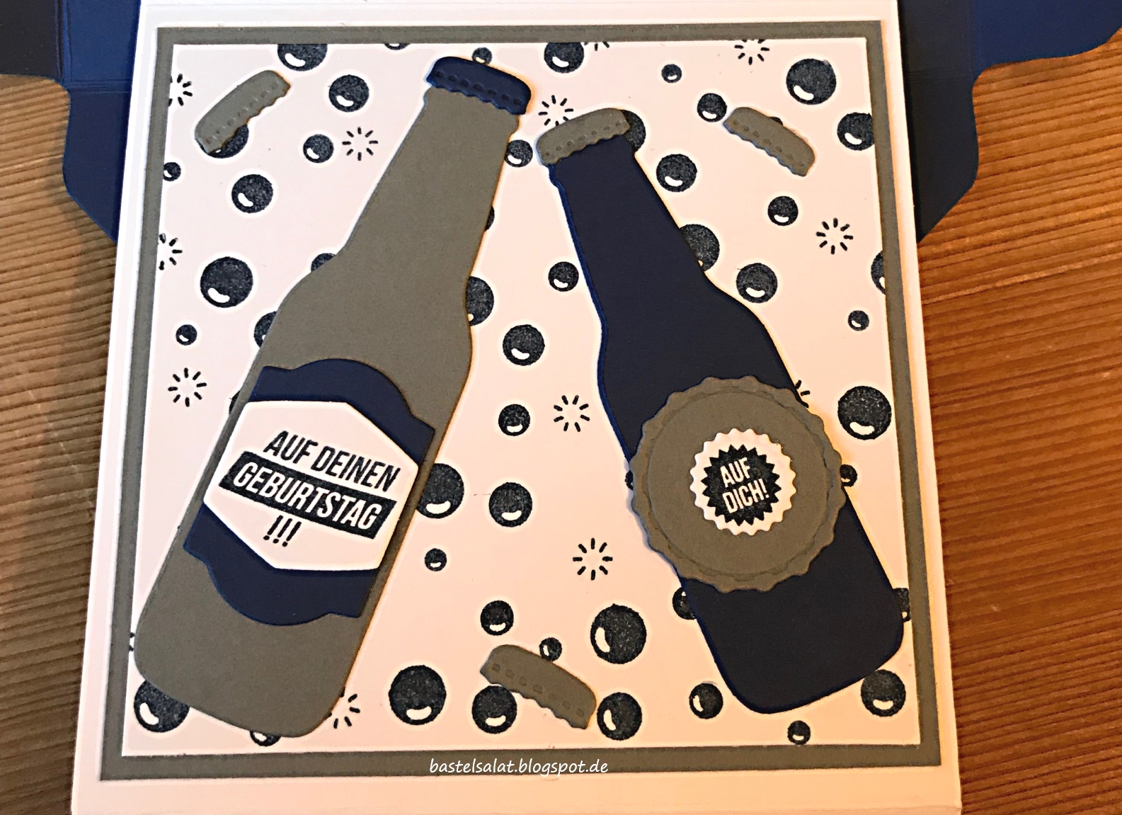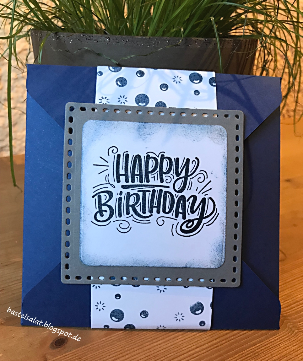 Damit der Übergang vom Flüsterweißen auf den Anthrazitgrauen Cardstock nicht so hart wirkt, habe ich den Rand einfach mit einem Schwämmchen mit den Farben Anthrazitgrau und Marineblau schattiert. Der Happy Birthday Stempel stammt aus dem Set „Celebrate You“.