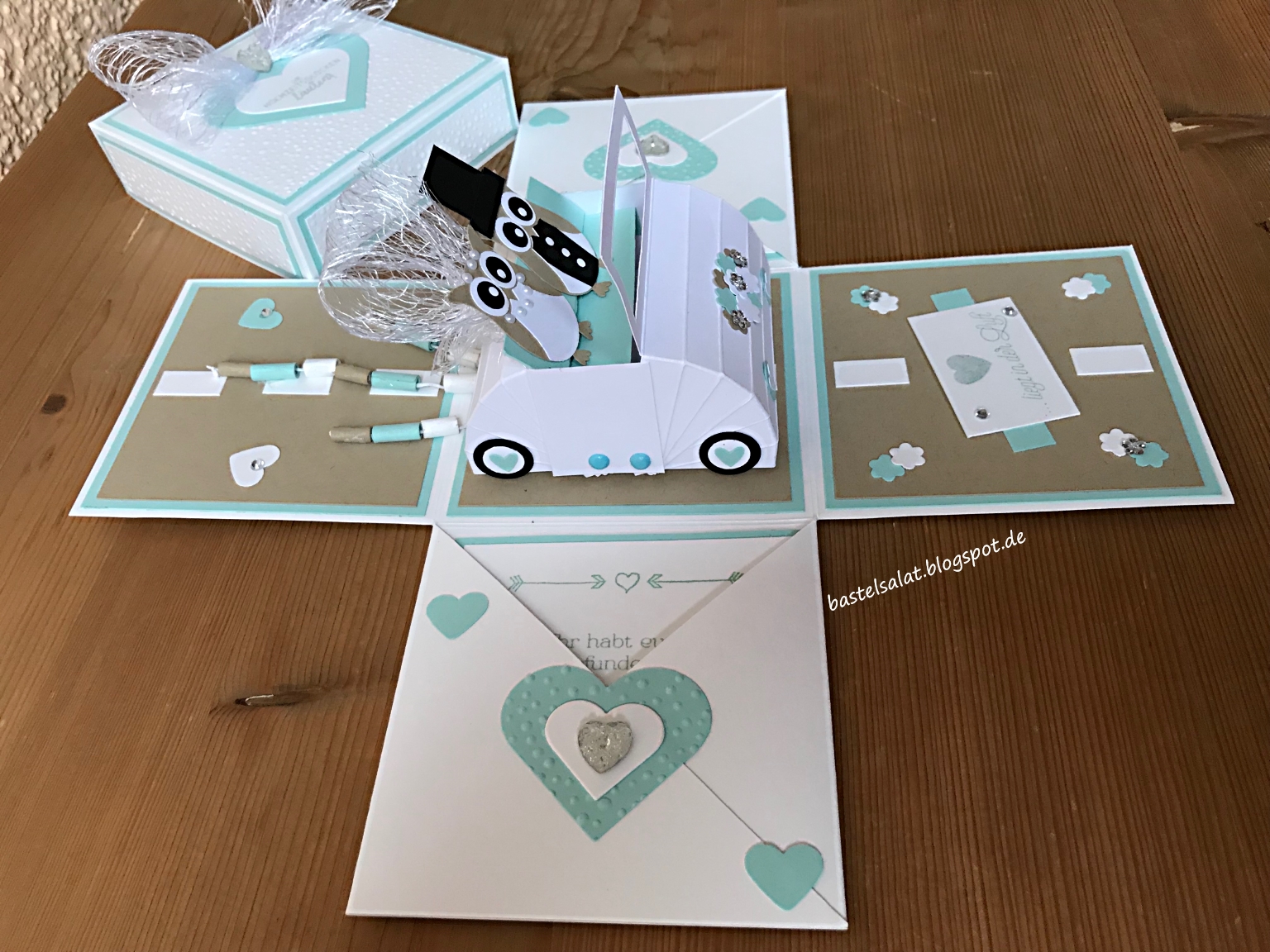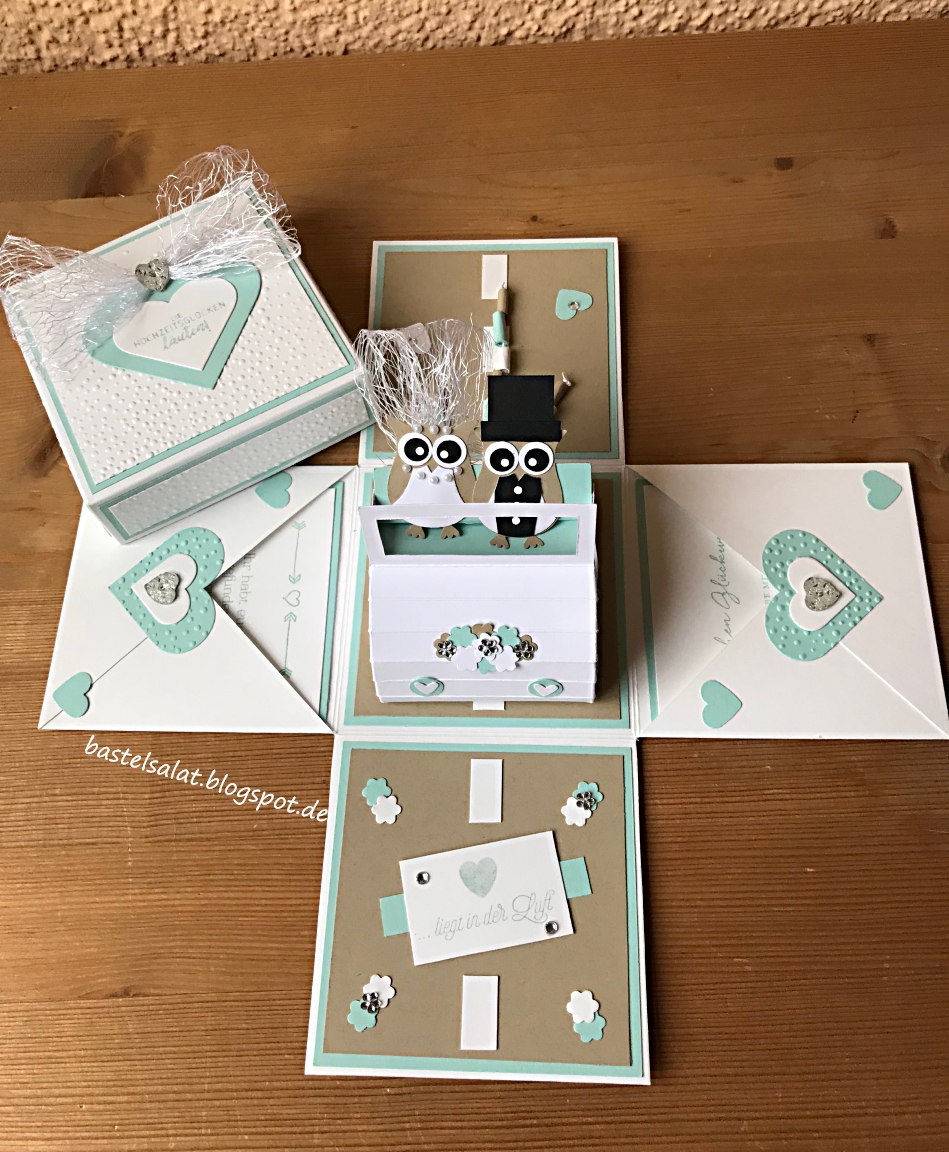 Das Brautauto, mit dem niedlichen Eulen-Brautpaar, befindet sich glĂŒcklicherweise sehr gut geschĂŒtzt in einer Explosionsbox, welche aus „FlĂŒsterweiĂen“ Cardstock in der Kombination mit „Savanne“ und „Aquamarin“ entstanden ist.