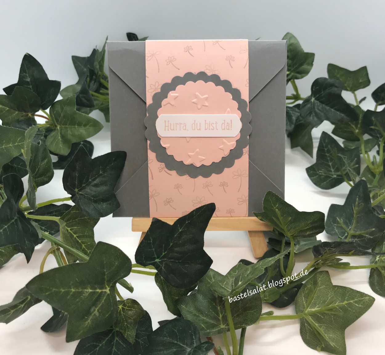 Die Banderole wurde nach dem bestempeln mit einem Stempel aus dem Set „Süßes Häschen“, mit ausgestanzten Wellenkreisen und einem Textspruch, welcher ebenfalls aus dem Stempelset „Süßes Häschen“ stammt, versehen.