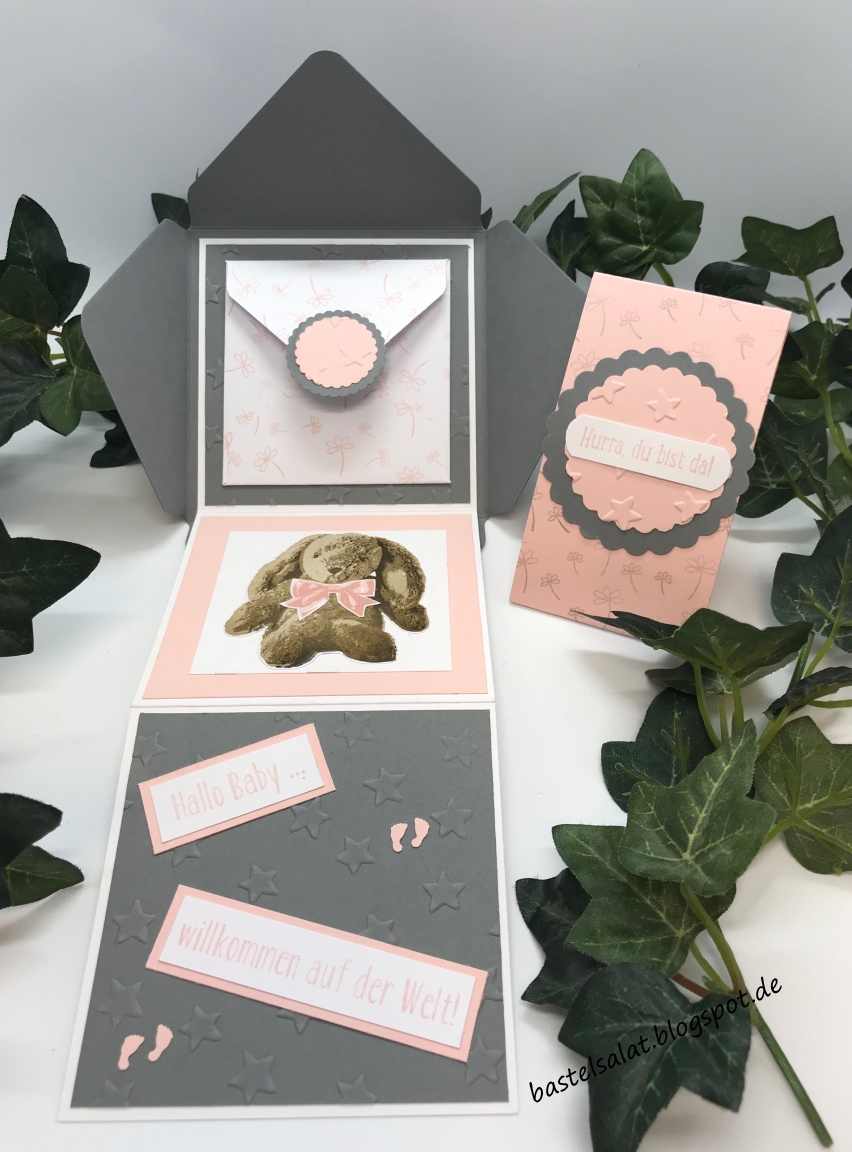 In dem 8 cm x 8 cm großen Briefumschlag, welcher mit einem Stempel aus dem Set „Süßes Häschen“ mit der Farbe Puderrosa bestempelt wurde,  versteckt sich ein kleines Grußkärtchen.