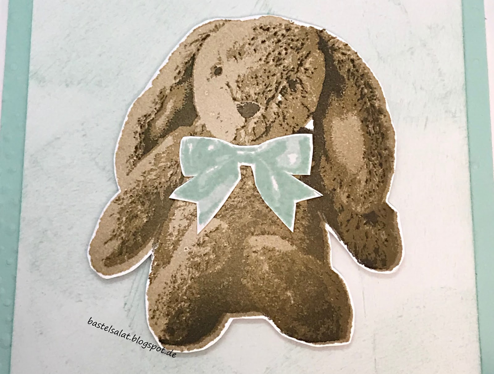 Das Zuckersüße Häschen ist mit den Farben „Savanne“, „Wildleder“ und „Espresso“ entstanden. Die Schleife, welche mit den Farben „Himmelbau“ und „Aquamarin“ gestempelt ist, stammt eigentlich aus dem Stempelset „Unentbätliche Grüße“, passt aber auch super zu dem kleinen Hoppel, oder?