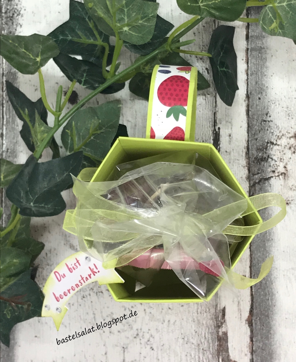 Bei der Herstellung der Tasse war das Schneide-/und Falzbrett, das Envelope Punch Board, die Bannerduo Stanze, die Erdbeerstanze aus dem Stanzpaket „Freche Früchten“, sowie das Stempelset „Gute-Laune-Korb“ im Einsatz.