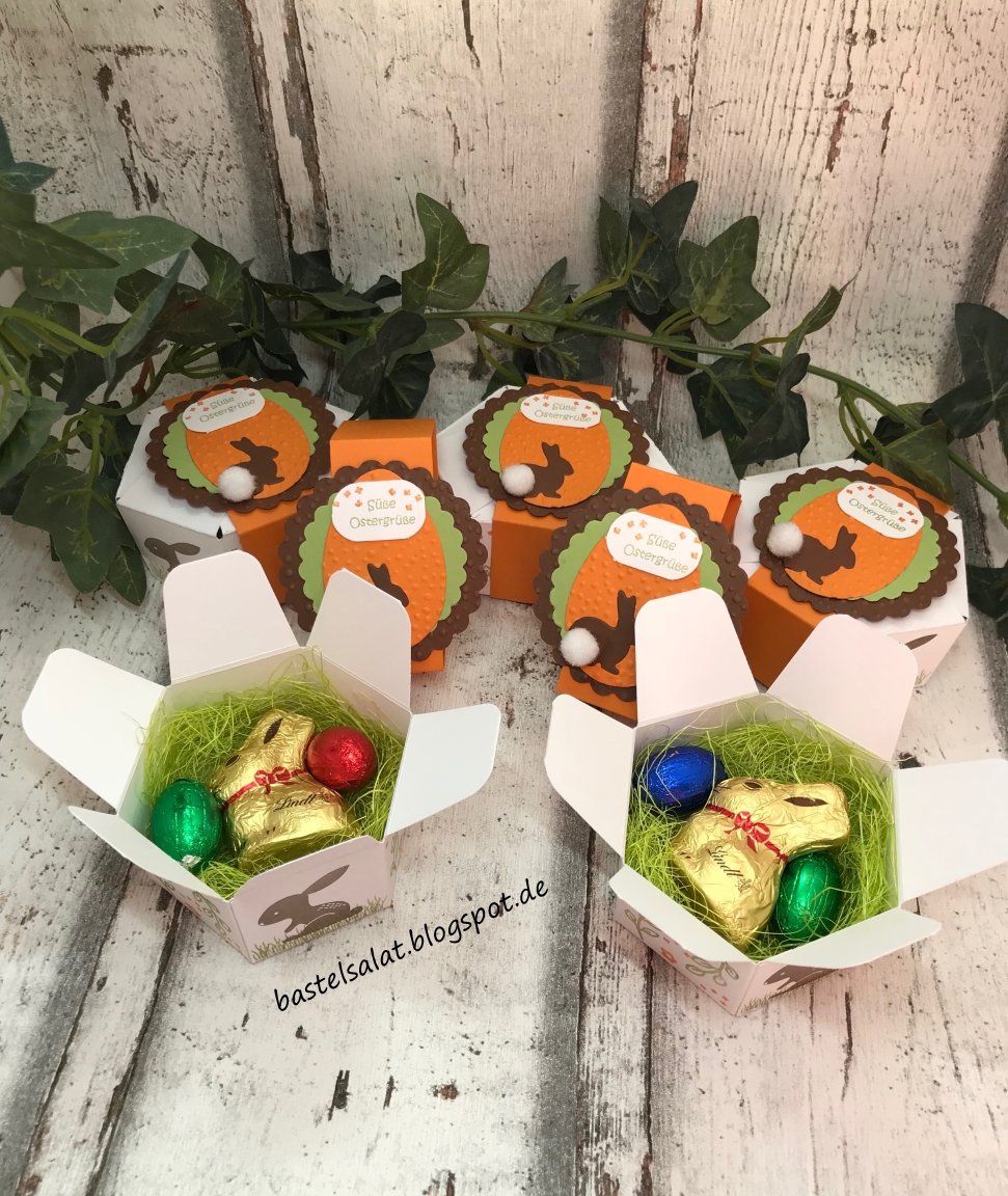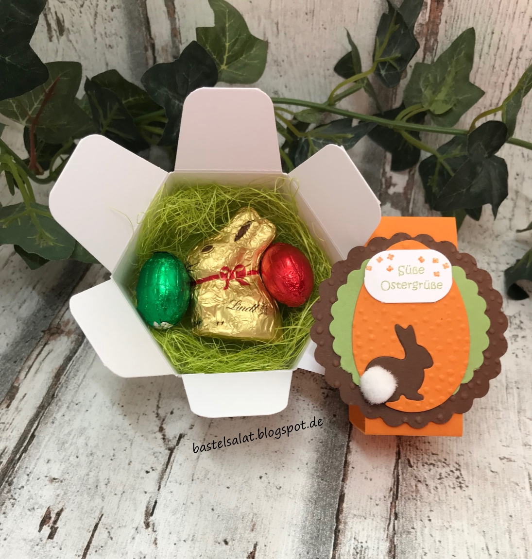 Ich habe sie mit ein bisschen Dekogras, 2 Schokoeiern und einem leckeren, kleinen Schokohasen befüllt.