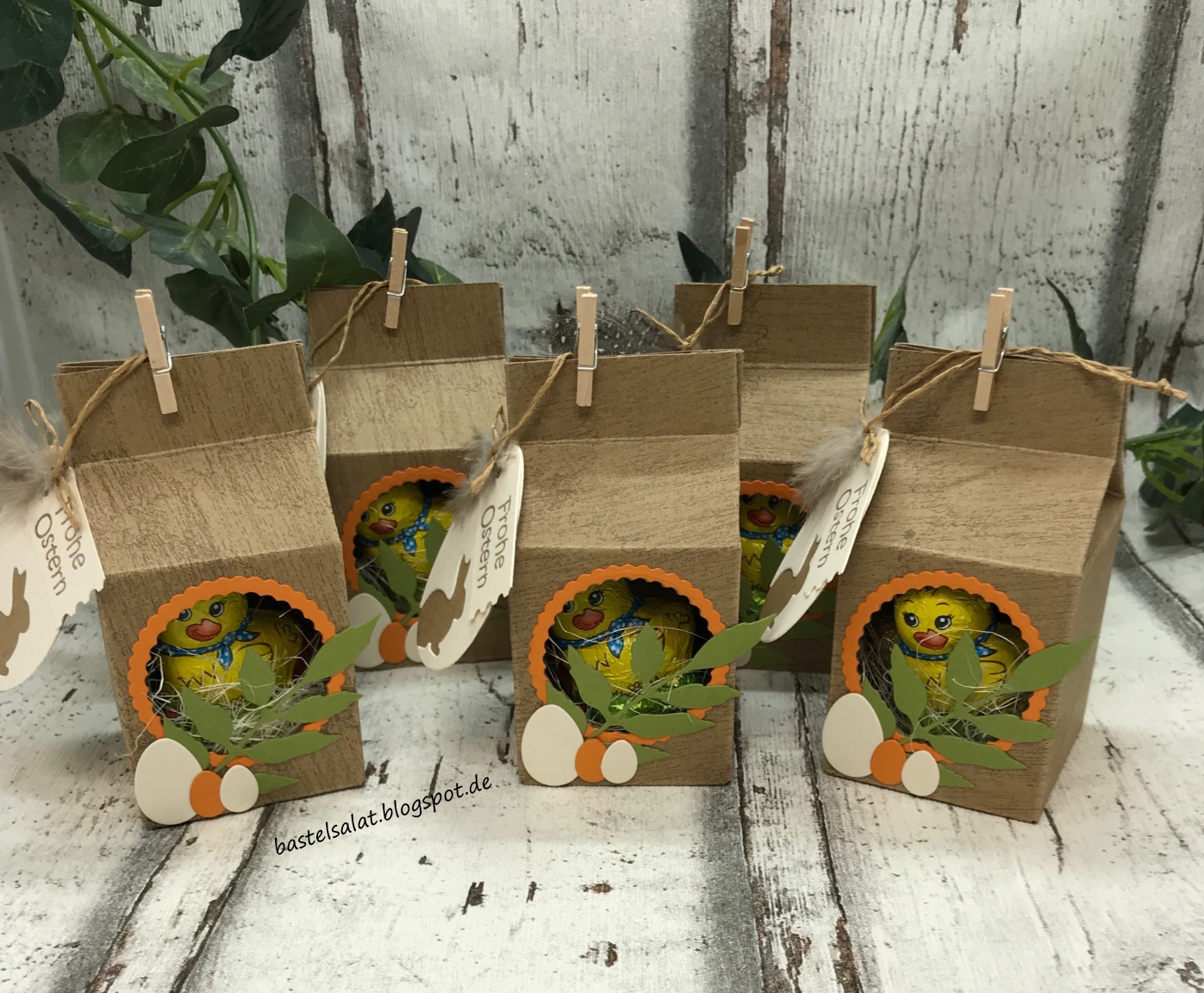 Mit einem olivgrünen Blätterzweig, einer kürbisgelben Umrandung für das Fenster (Loch) und den ausgestanzten Eiern (Vanillepur, Kürbisgelb) ist der Milchkarton dann noch schön dekoriert worden.