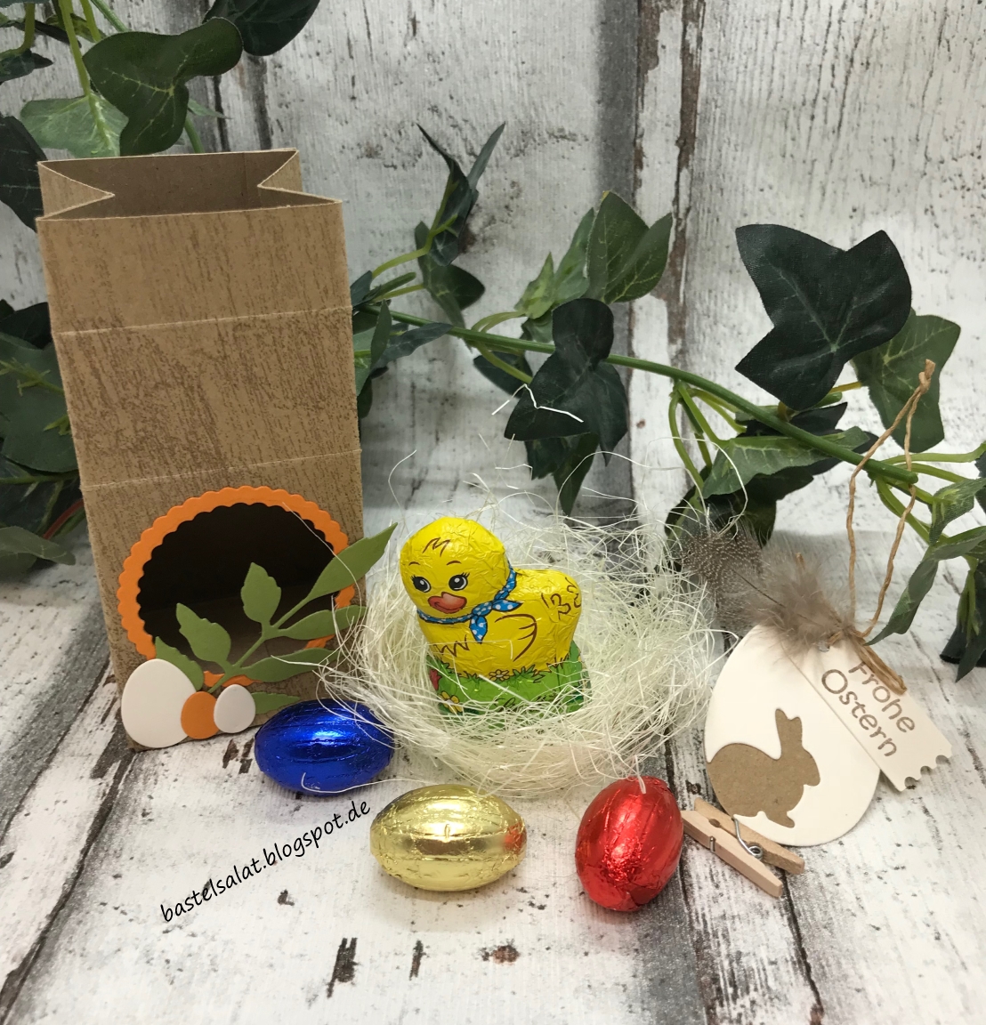 Mit den Endmaßen von 10.5 cm x 5 cm hat der niedliche Milchkarton eine angenehme Größe und bietet im Inneren genügend Platz dem leckeren Küken und 3 Schokoladeneiern ein gemütliches Nest zu bieten.