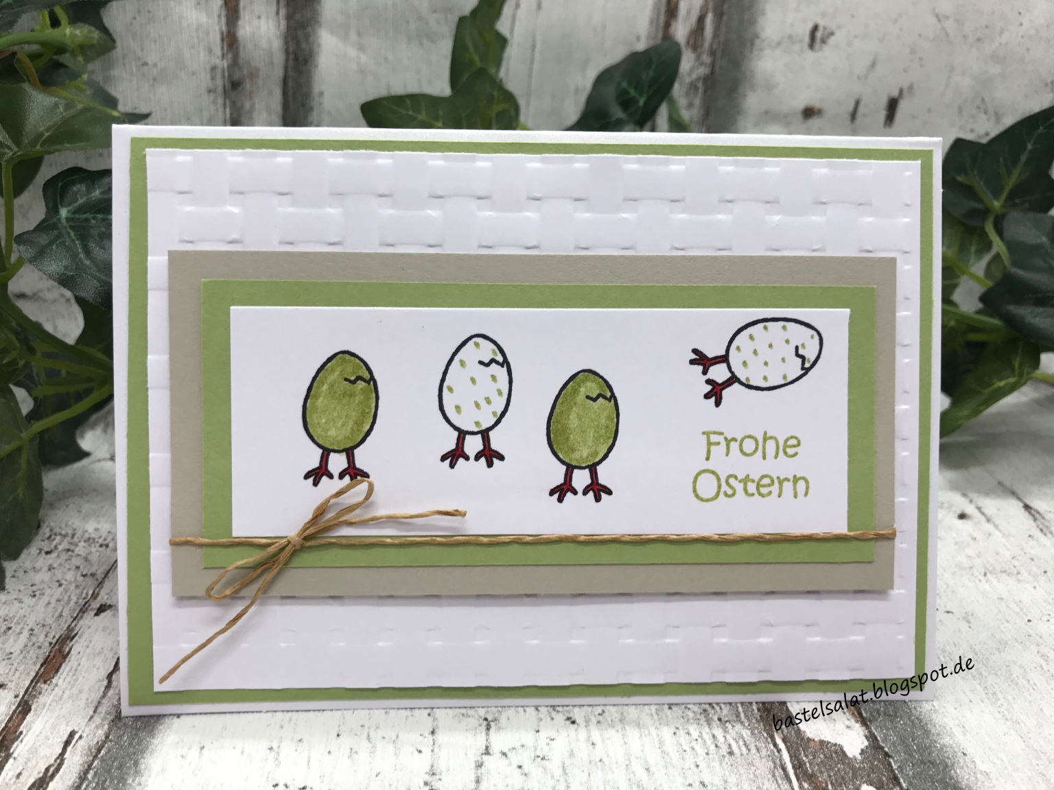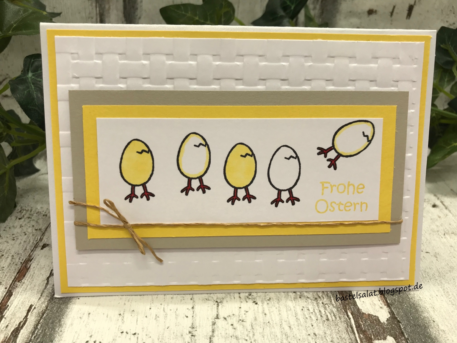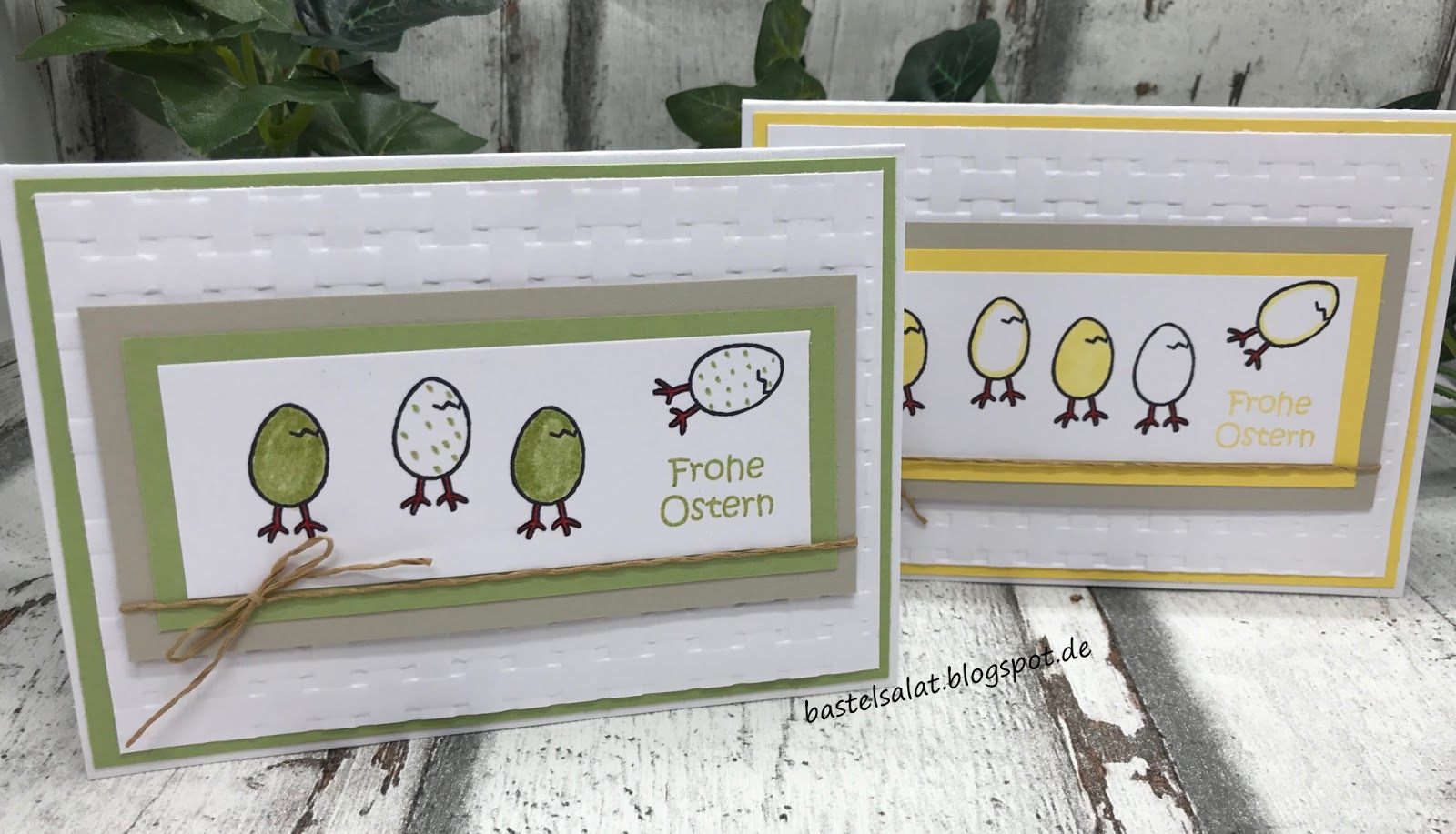 Bei den folgenden Karten kam Cardstock in „Flüsterweiß“ und „Saharasand“, das Stempelset „Vielseitige Grüße“ , sowie ebenfalls die Tiefen-Prägeform „Korbgeflecht“ zum Einsatz. Zum ausstanzen der „Eier“ habe ich auf Thinlits von Sizzix zurückgegriffen.