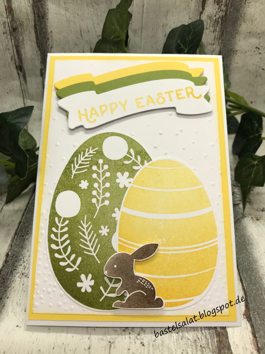 Die nächste Karte kennt ihr bestimmt schon von hier.  Diesmal ist der Layer mit der Form „Leise rieselt“ geprägt und wurde nicht mit einem Schwammwälzen bearbeitet. Bei den gestempelten + ausgeschnittenen Eiern habe ich die Farben getauscht 😇.