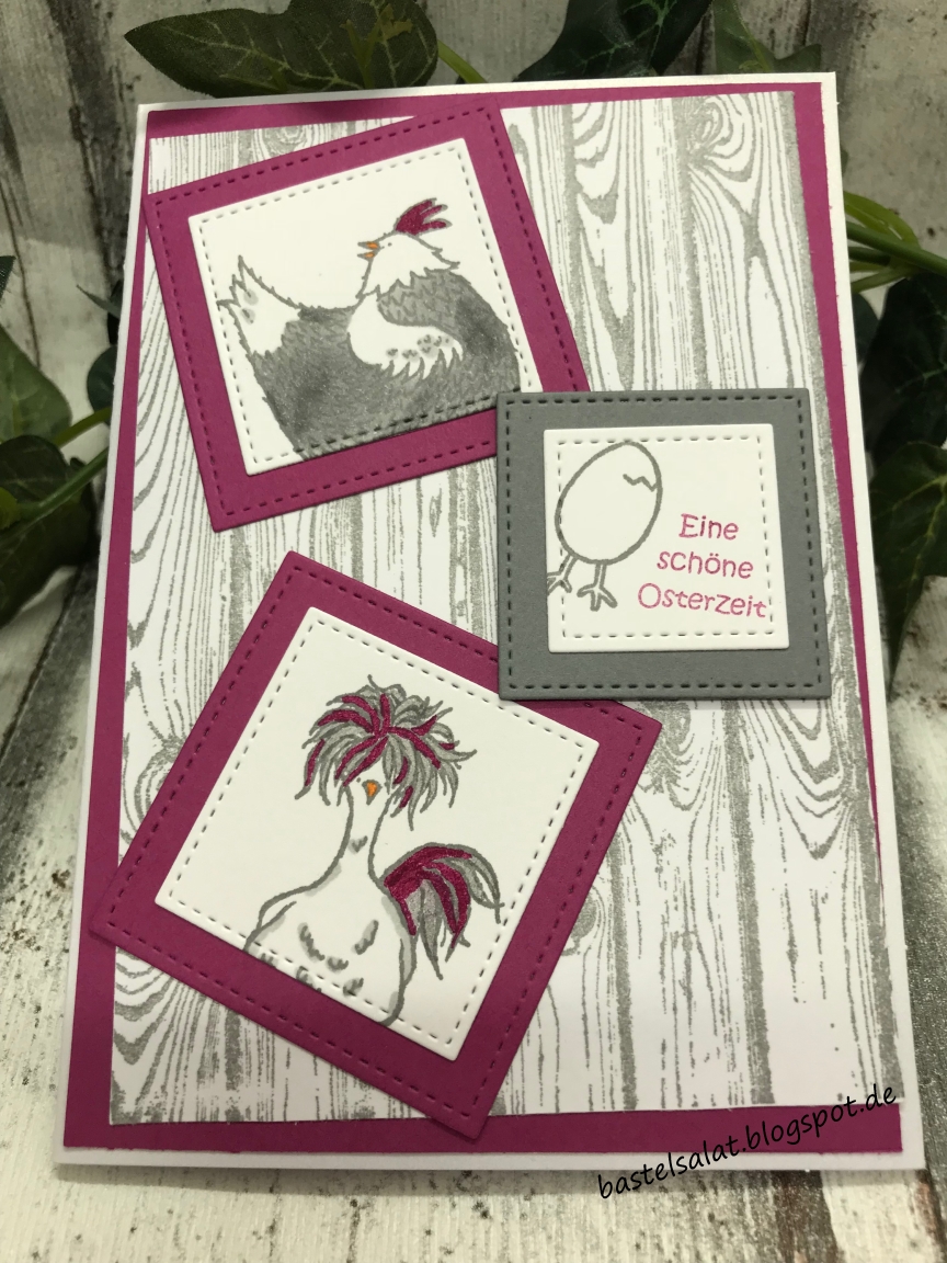 Nun kommen wir zur letzten Karte für heute. Diese ist mit dem Hintergrundstempel „Hardwood“, den Thinlits „Stickmuster“, dem Stempelset „Das gelbe vom Ei“, Cardstock in den Farben „Flüsterweiß“ „Anthrazitgrau“ + „Sommerbeere“, sowie dem Stampin’n write Marker „Sommerbeere“ und den Stampin‘ Blends „Hell-Schiefergrau“ + „Dunkel-Schiefergrau“ entstanden.
