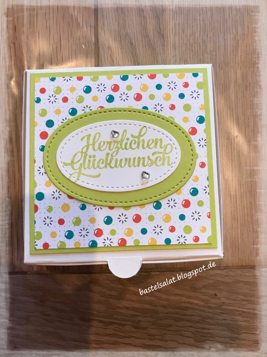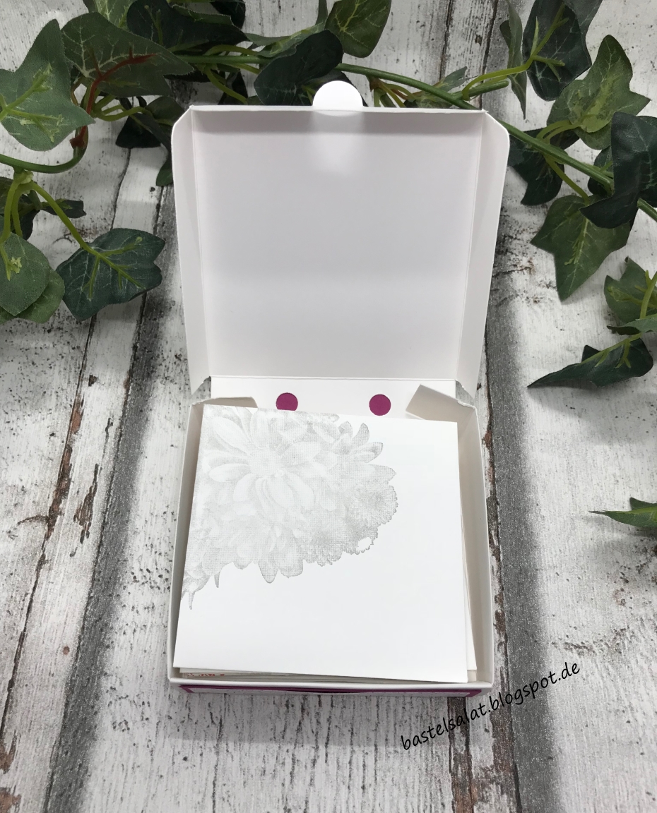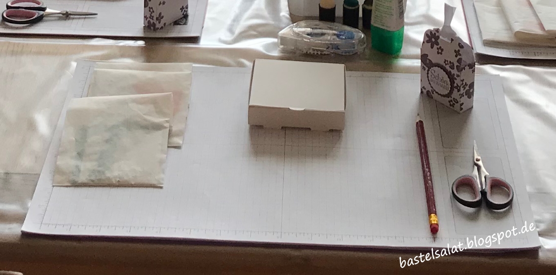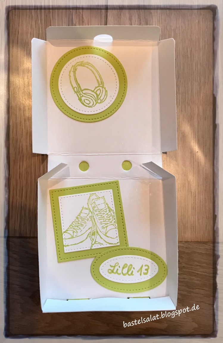 Ich hatte 3 Mini Grußkarten (8 cm x 8 cm), sowie einen kleinen Pizzakarton als Muster vorbereitet