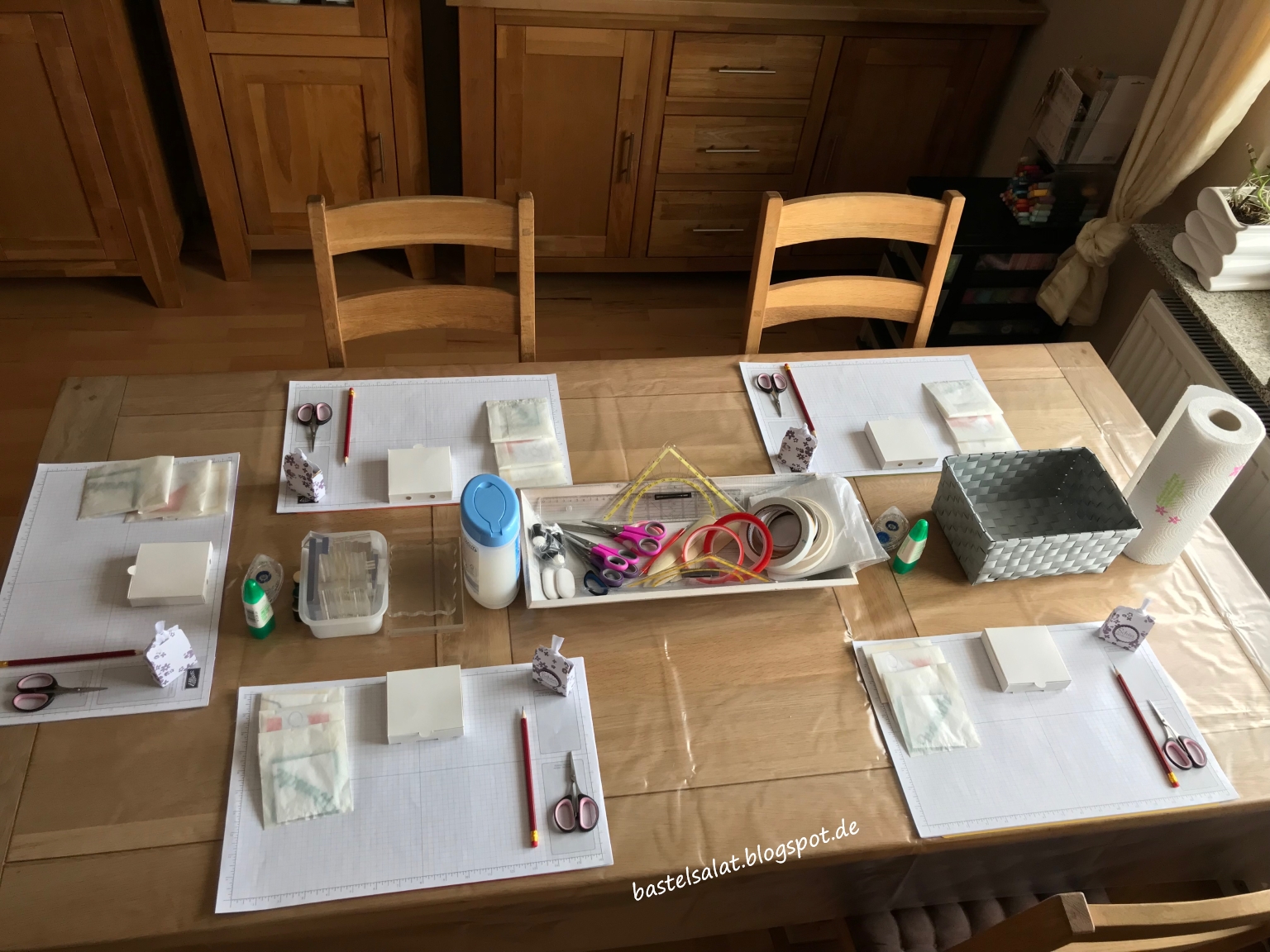 Jeder Workshopteilnehmer fand an seinem Platz eine kleine (blanko) Pizzaschachtel, gefĂŒllt mit Blanko Minikarten inkl. UmschlĂ€ge, 3 vorbereitet TĂŒtchen mit zum Teil bereits ausgestanzten Teilen, sowie ein kleines Gastgeschenk.