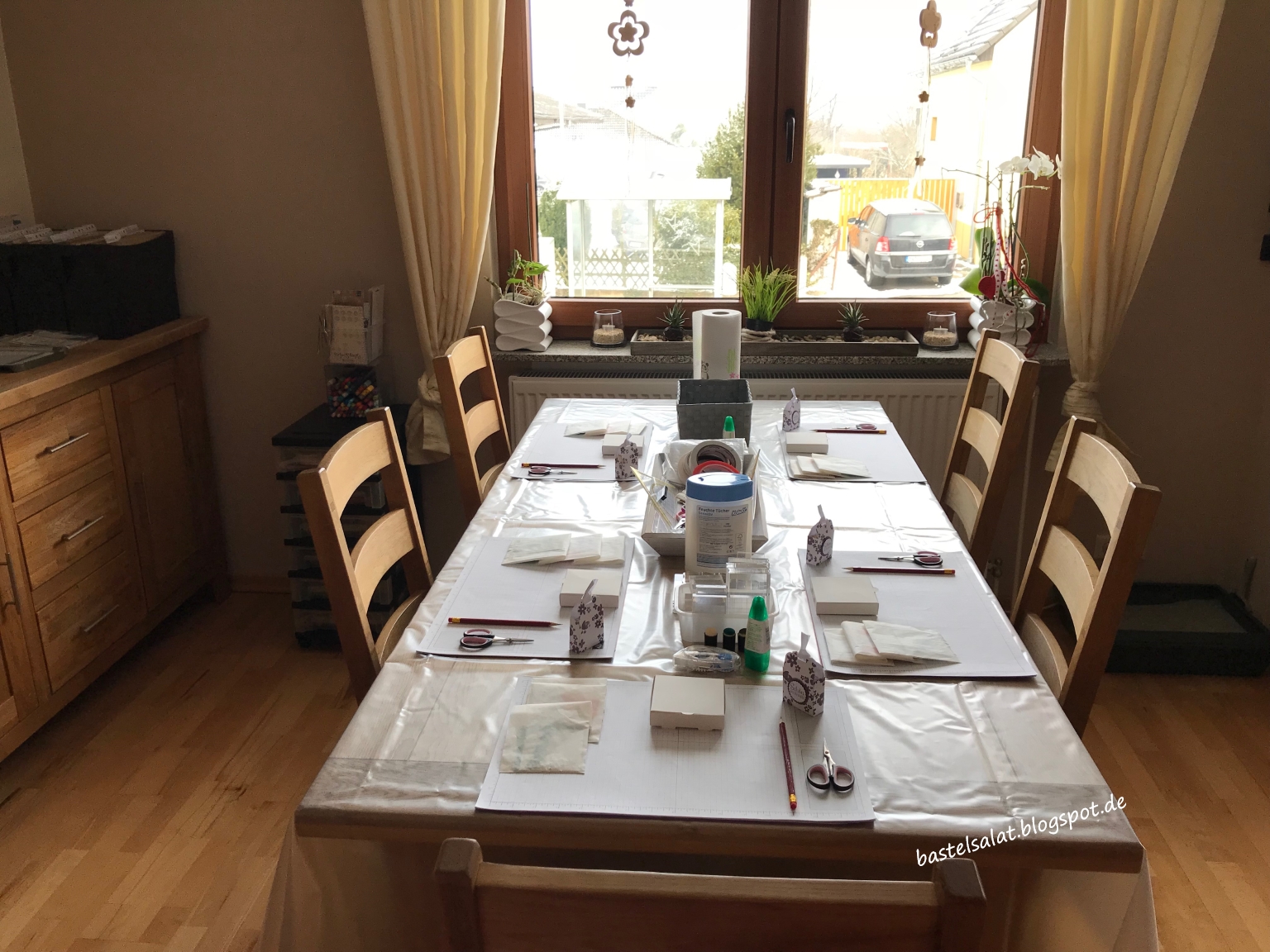 Jeder Workshopteilnehmer fand an seinem Platz eine kleine (blanko) Pizzaschachtel, gefĂŒllt mit Blanko Minikarten inkl. UmschlĂ€ge, 3 vorbereitet TĂŒtchen mit zum Teil bereits ausgestanzten Teilen, sowie ein kleines Gastgeschenk.