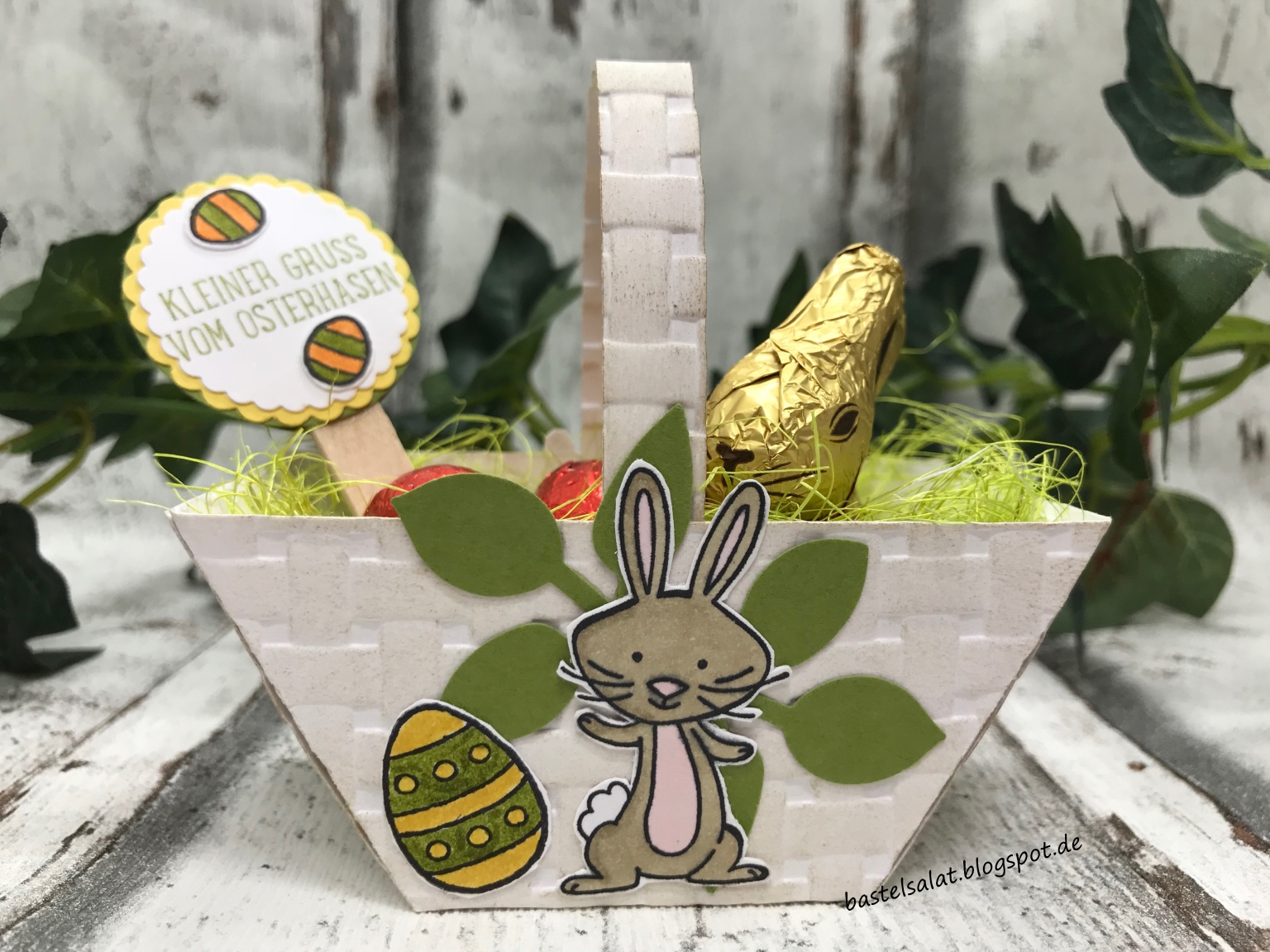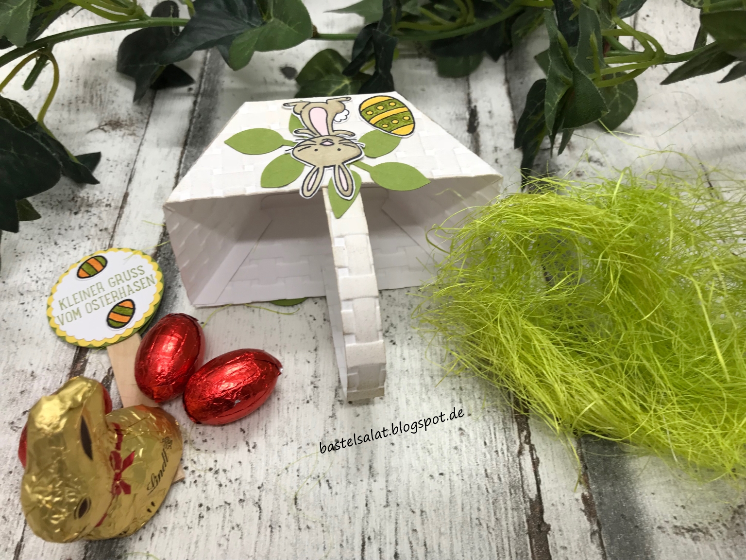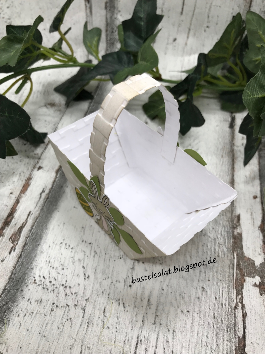 Das Osterkörbchen ist aus „Flüsterweißem“ Cardstock mit den Thinlits Formen „Fensterschachtel“ und der Tiefen Prägeform „Korbgeflecht“ entstanden.