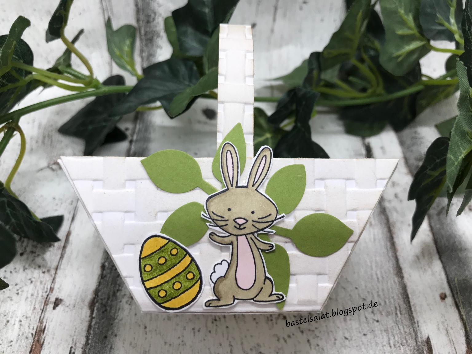 Zur Dekoration verwendete ich die Stanze „Blätterzweig“, ein in den Farben „Osterglocke“ und „Olivgrün“ koloriertes Ei aus dem Stempelset „Osterkörbchen“, sowie das Stempelset „We must Celebrate“, in dem ihr den niedlichen Hasen findet.