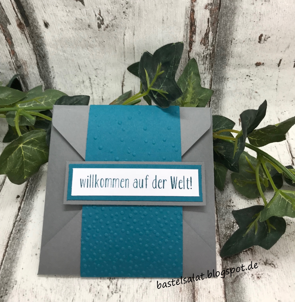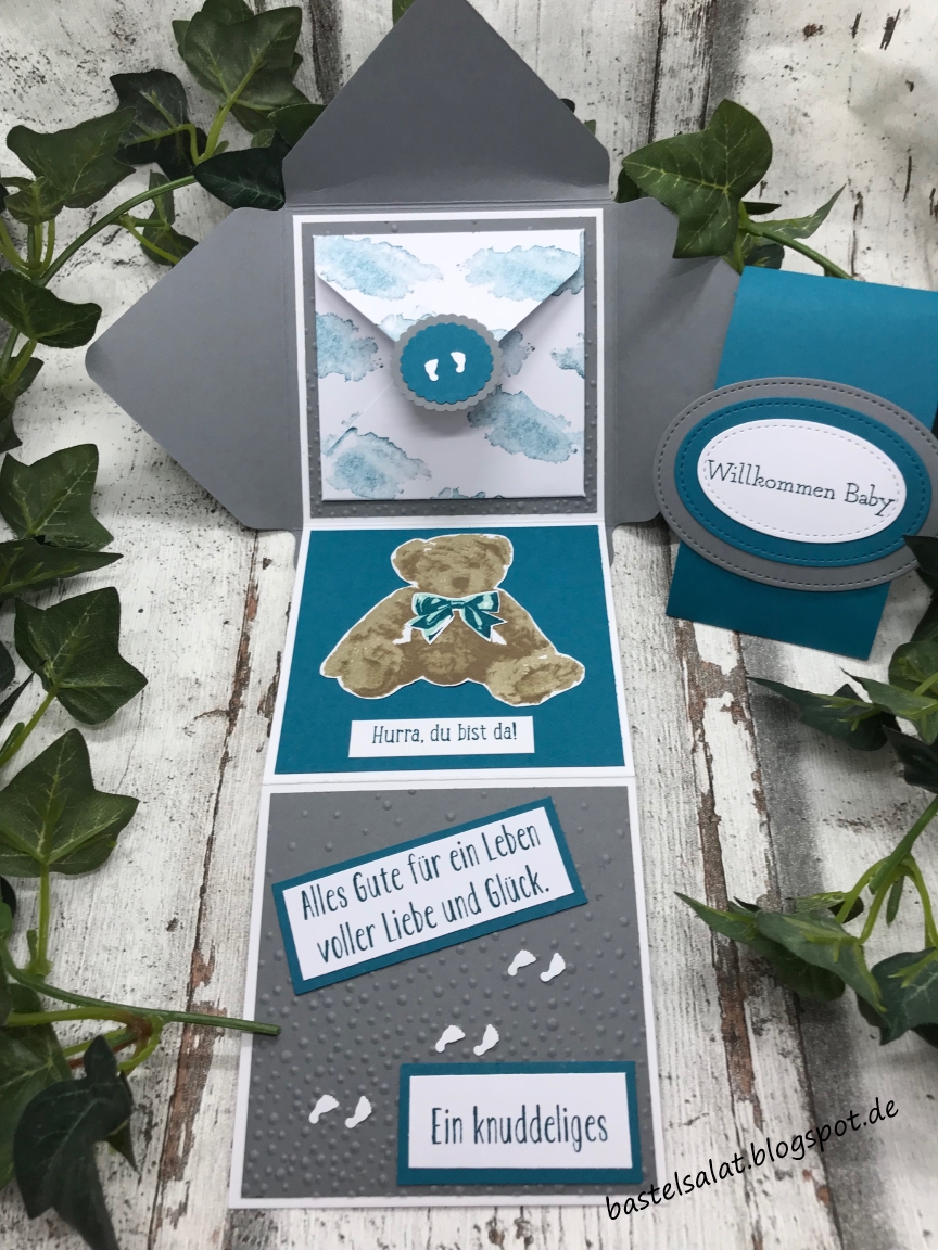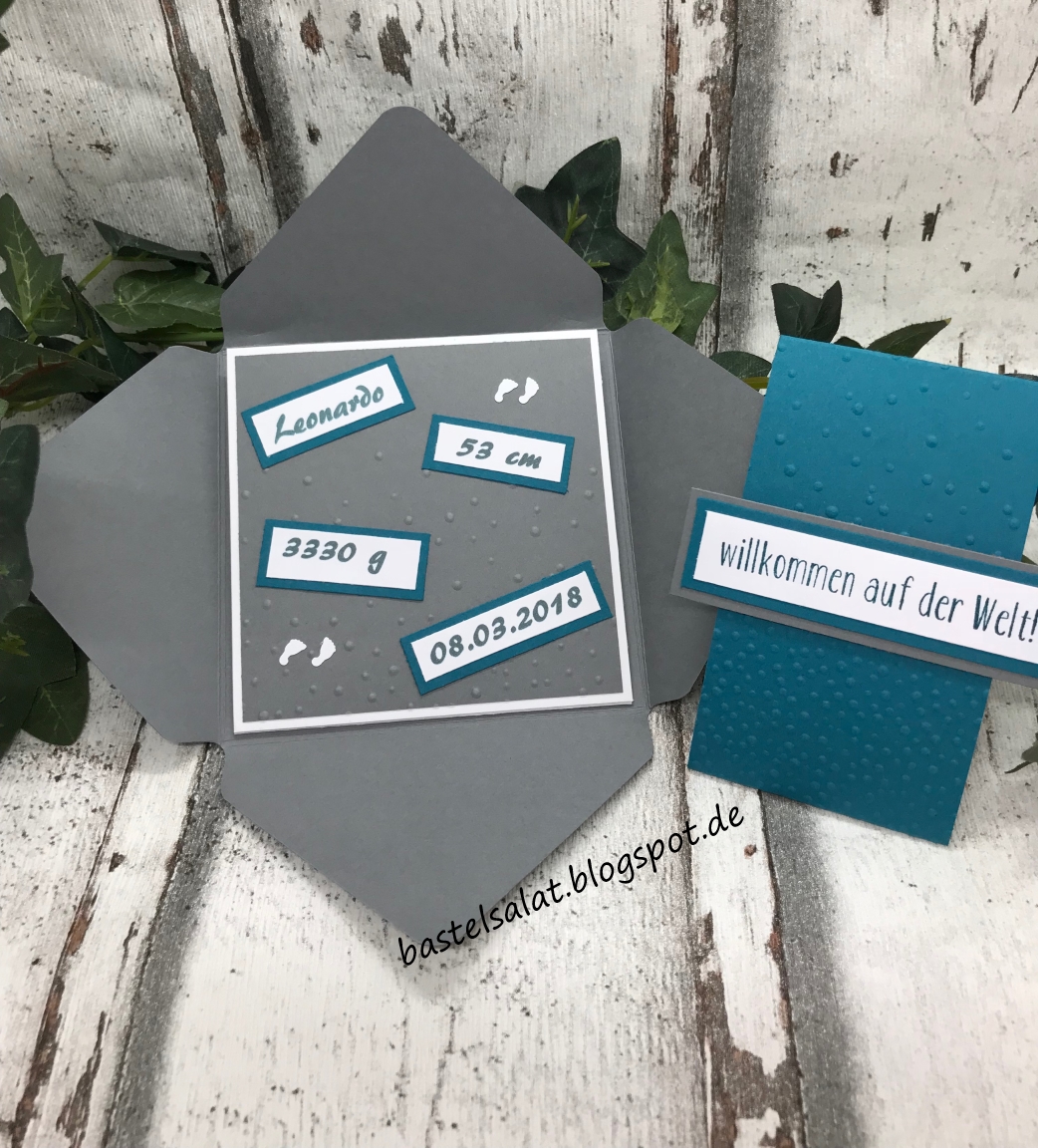 Bei diesem Leporello habe ich mit den Wellenkreisstanzen, dem Prägefolder „Leise rieselt“ und den Stempelsets „Vielseitige Grüße“, „Unentbärliche Grüße“, „Süßes Häschen“ und „Doppelt gemoppelt gearbeitet. Den Namen, das Geburtsdatum, Größe und Gewicht wurden auf dem PC geschrieben.