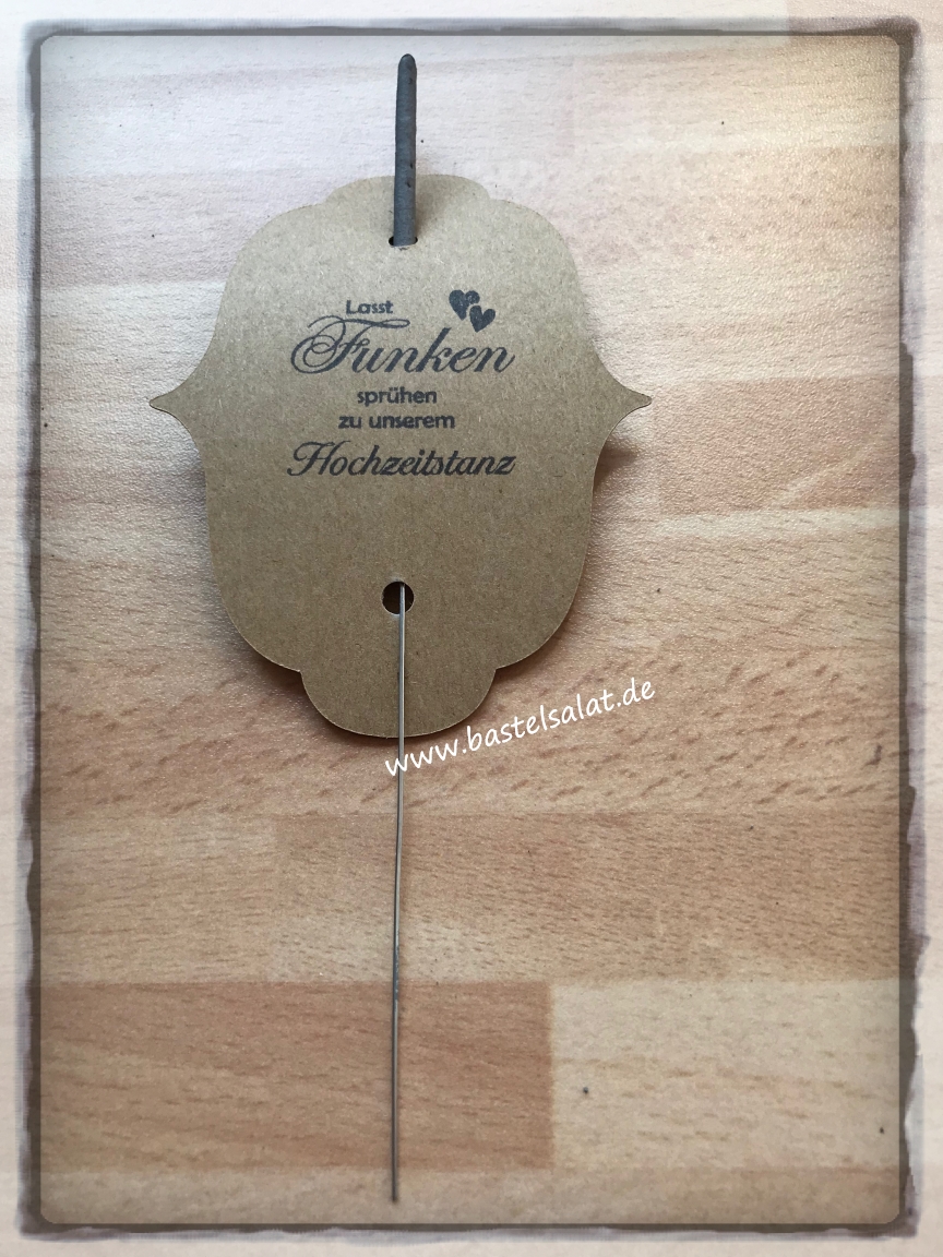 Der Spruch „Lasst Funken sprühen zu unserem Hochzeitstanz“ ist auf Wunsch in Schwarz gestempelt.