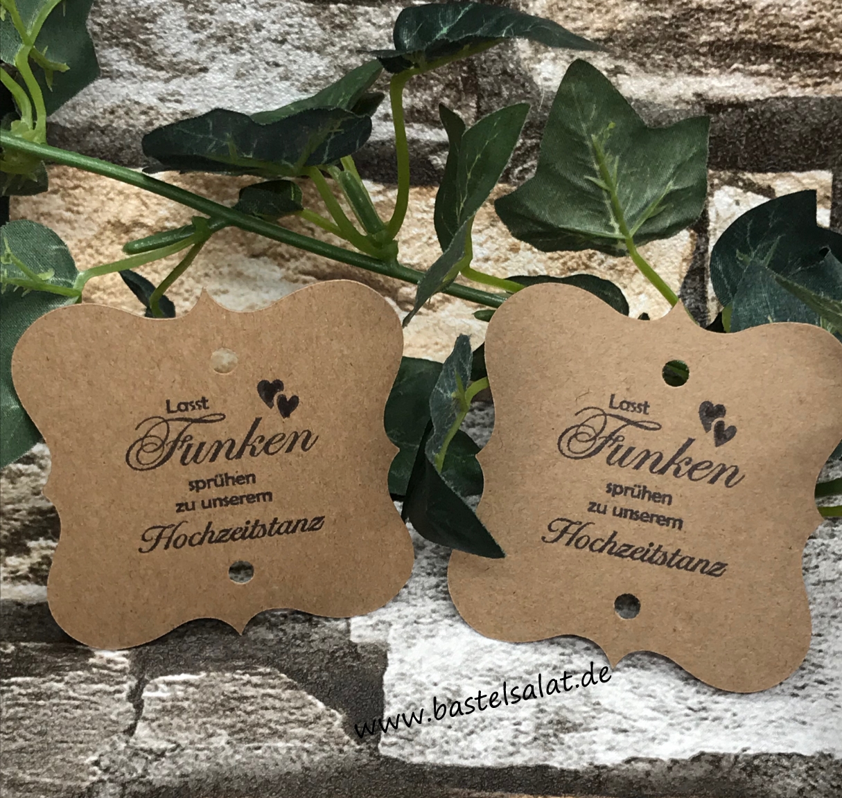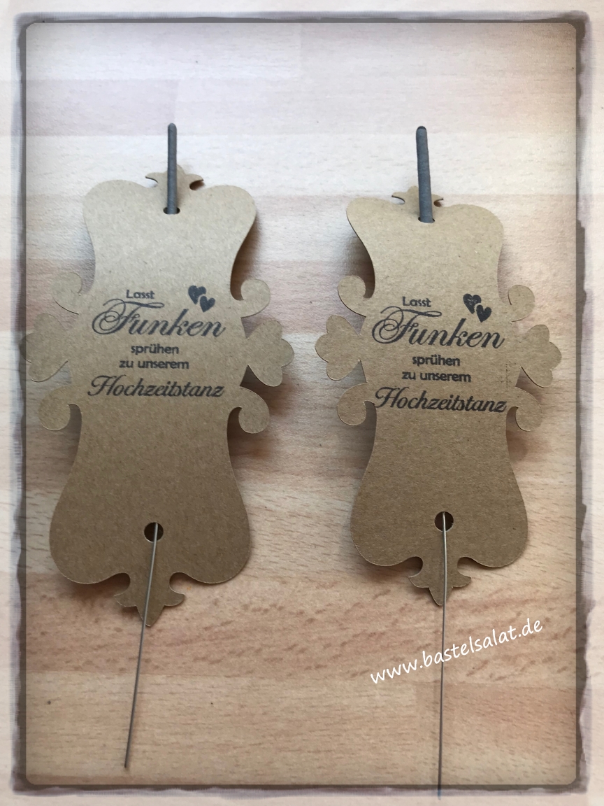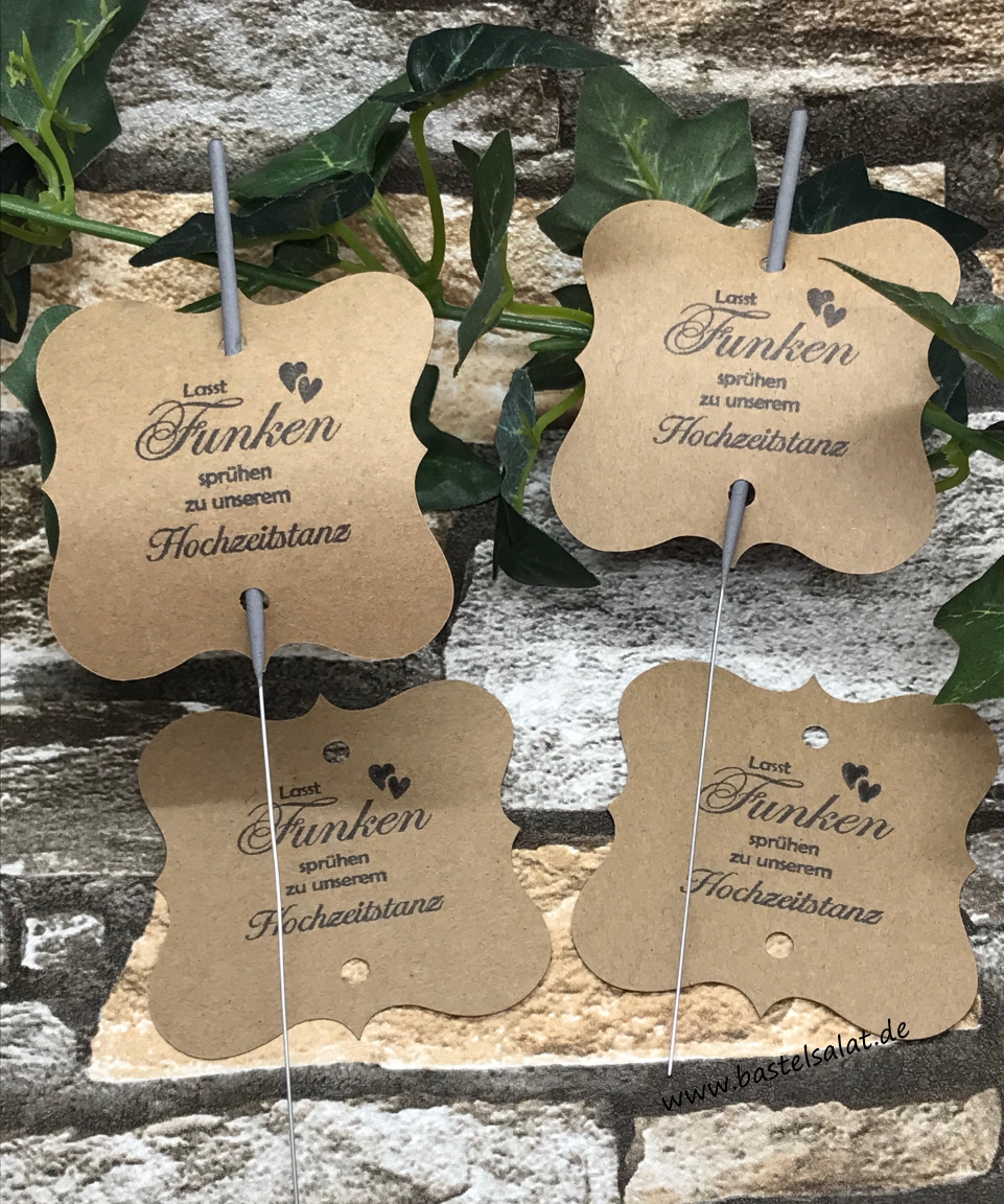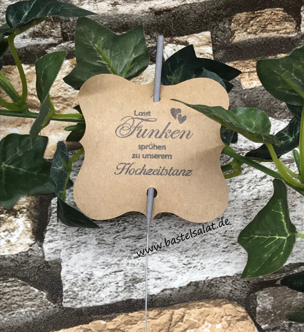Der Spruch „Lasst Funken sprühen zu unserem Hochzeitstanz“ ist auf Wunsch in Schwarz gestempelt.