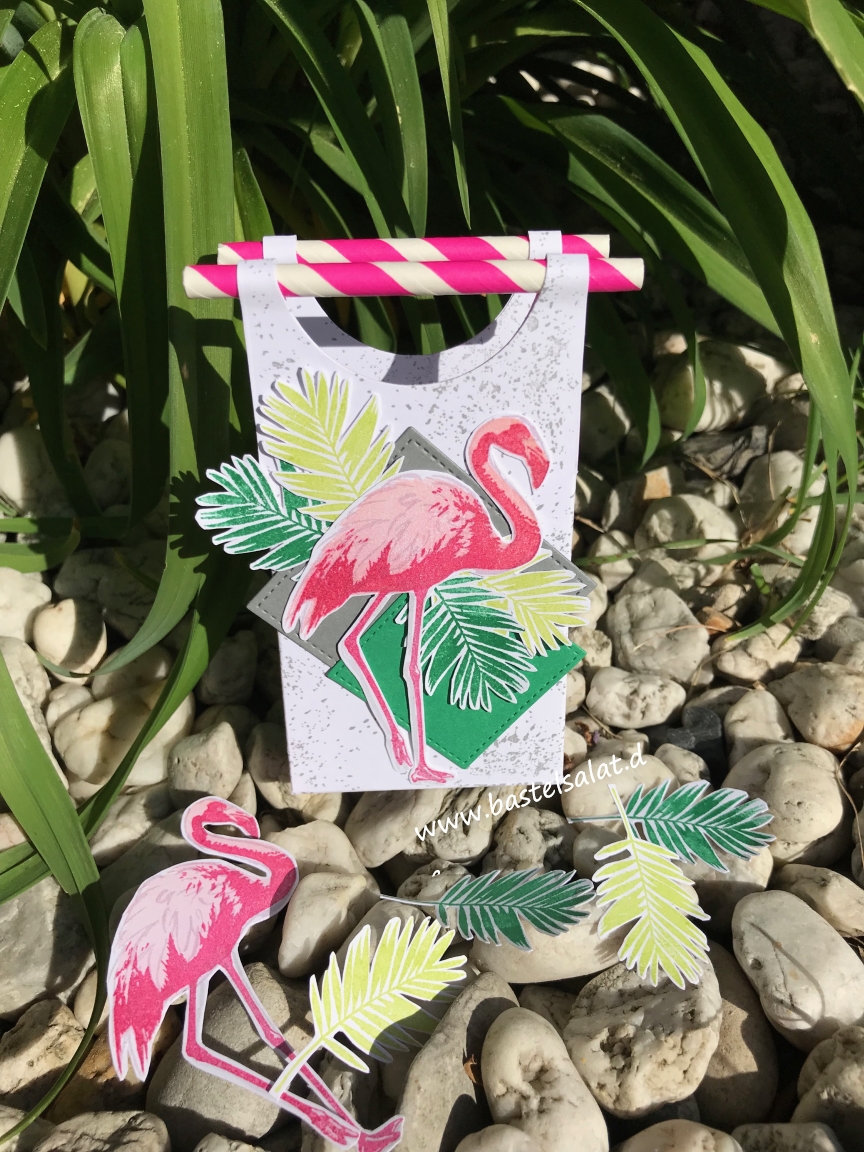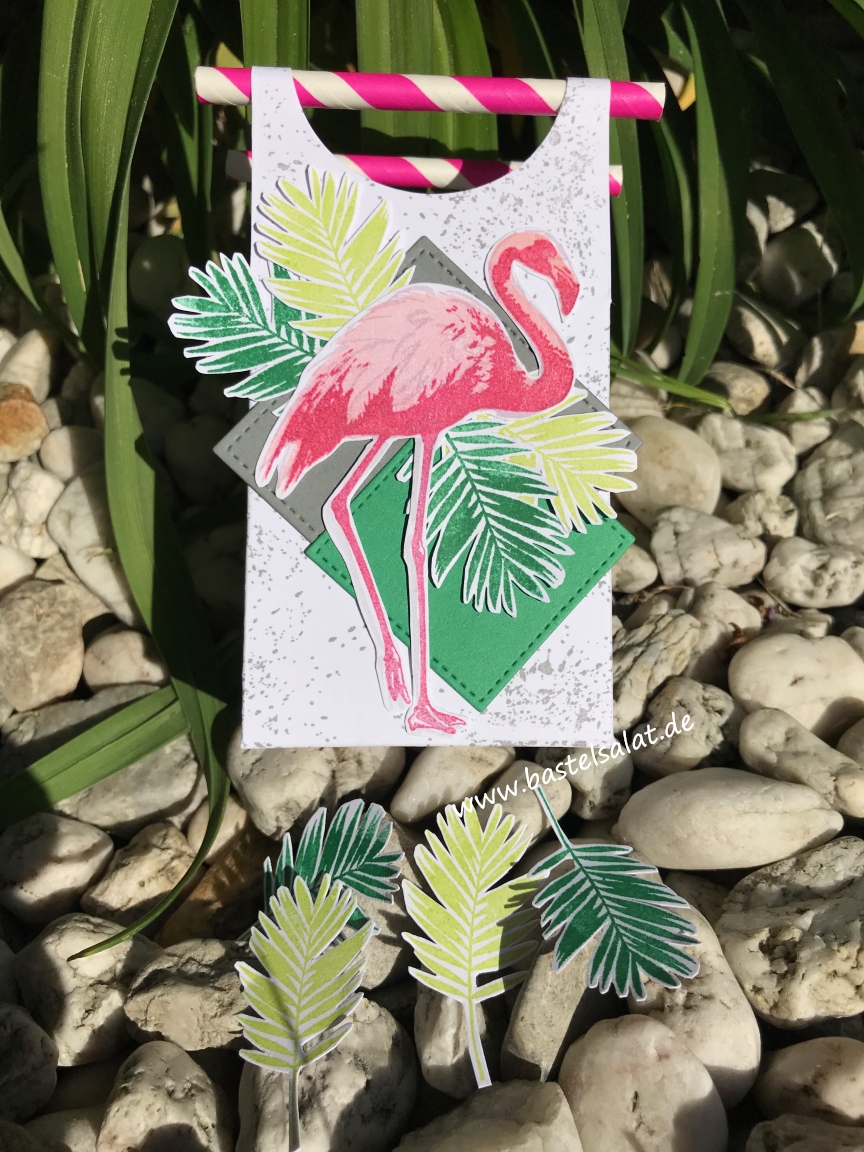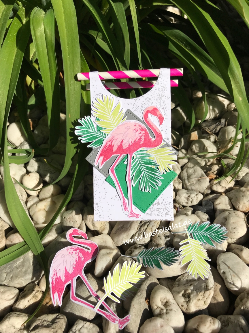 Den Flamingo und die BlĂ€tter habe ich mit der Schere (es gibt leider keine Framelits/Thinlits Formen fĂŒr dieses Stempelset) ausgeschnitten.