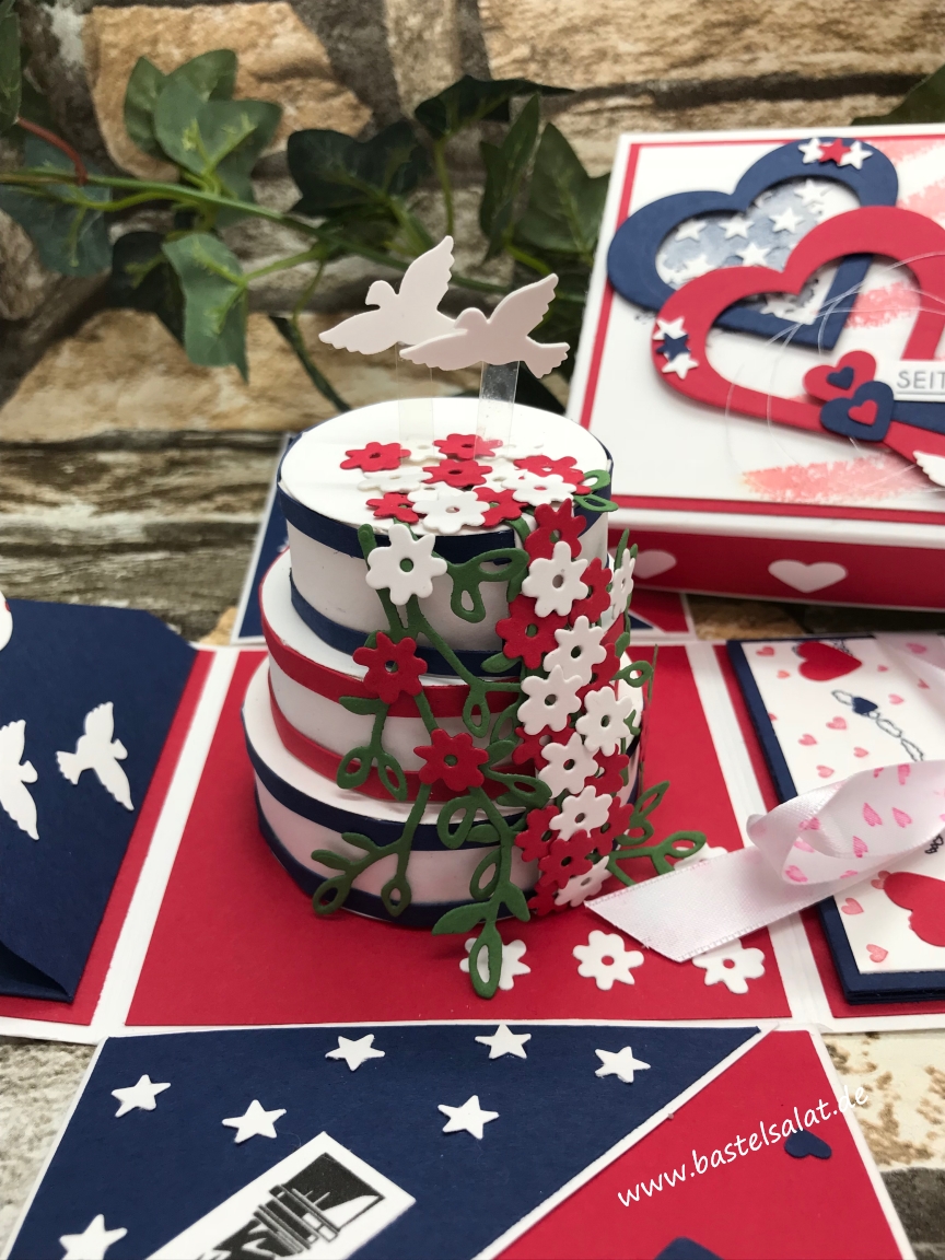 Im inneren durfte eine Hochzeitstorte, bei der die Verzierung mit einem Thinlit aus „Blüten, Blätter & Co, sowie einem Framelits aus „Schürze“ entstanden ist, nicht fehlen.