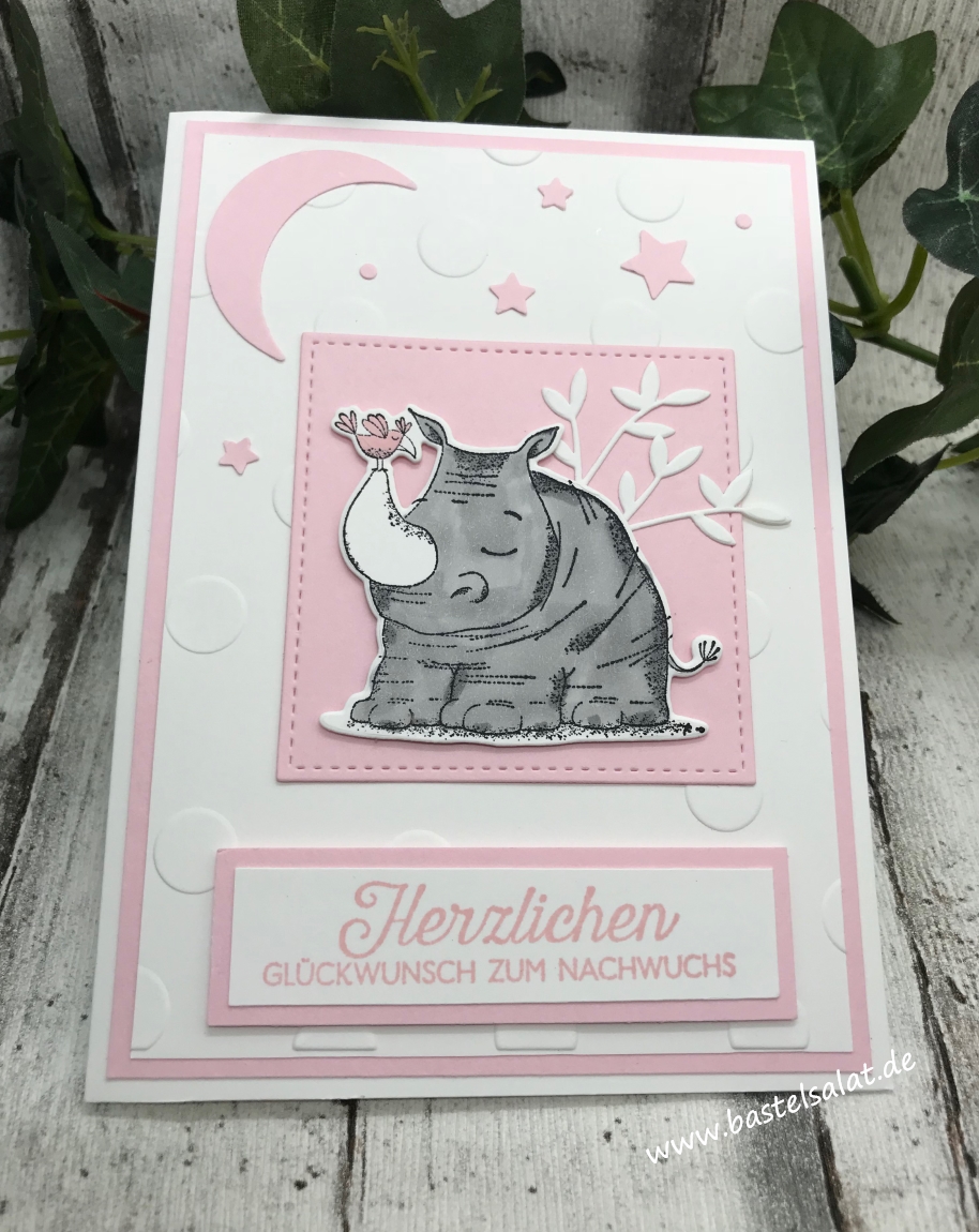 Mit den Farben „FlĂŒsterweiß“ und „Zartrosa“ ist diese Karte zur Geburt entstanden.