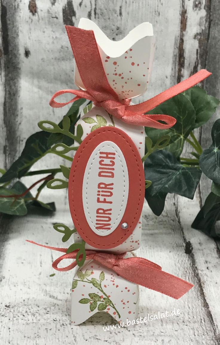 Zum verzieren habe ich die Framelits „Stickmuster“, die Thinlits „Blüten, Blätter & Co“, einen Stempel aus dem Set „Für Schatzkarten“, sowie schimmerndes Geschenkband in der Farbe Calypso verwendet.