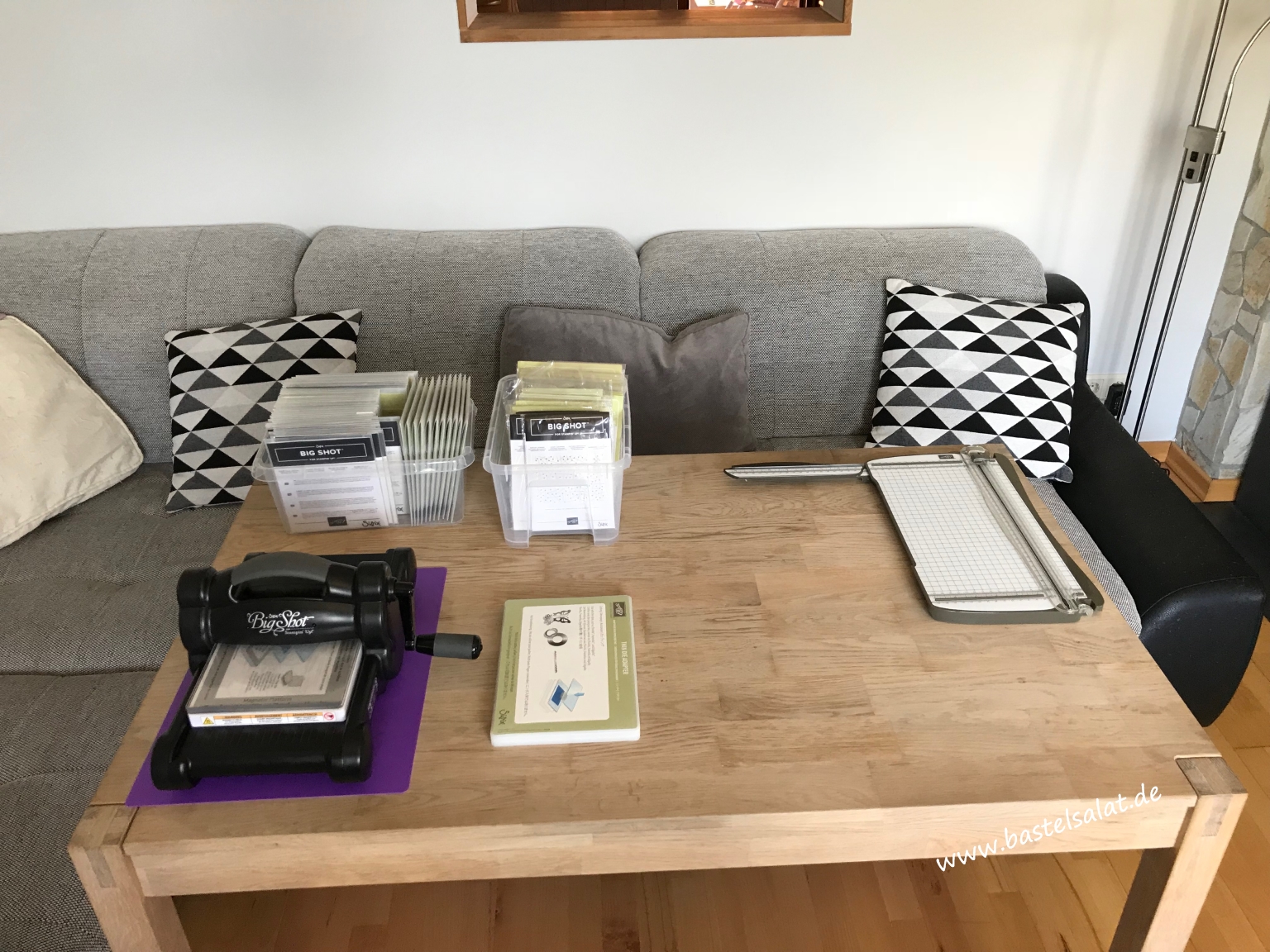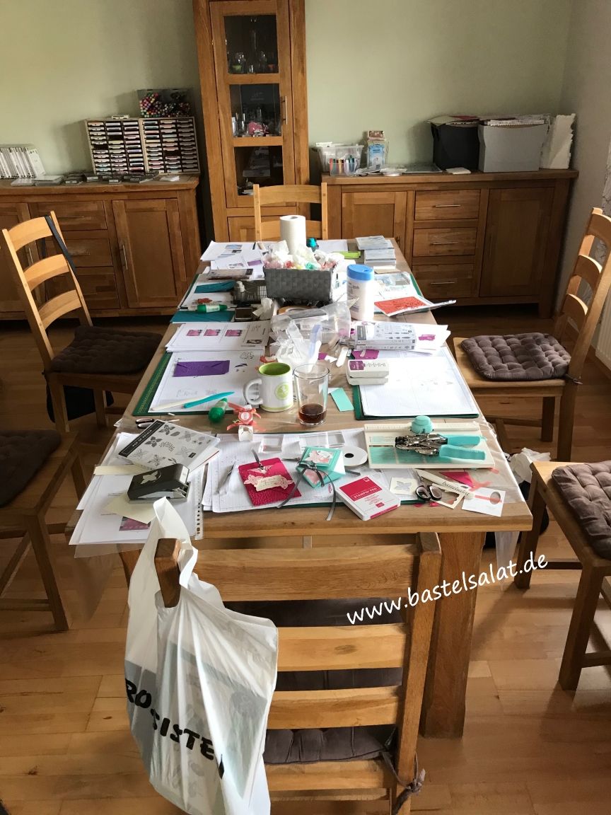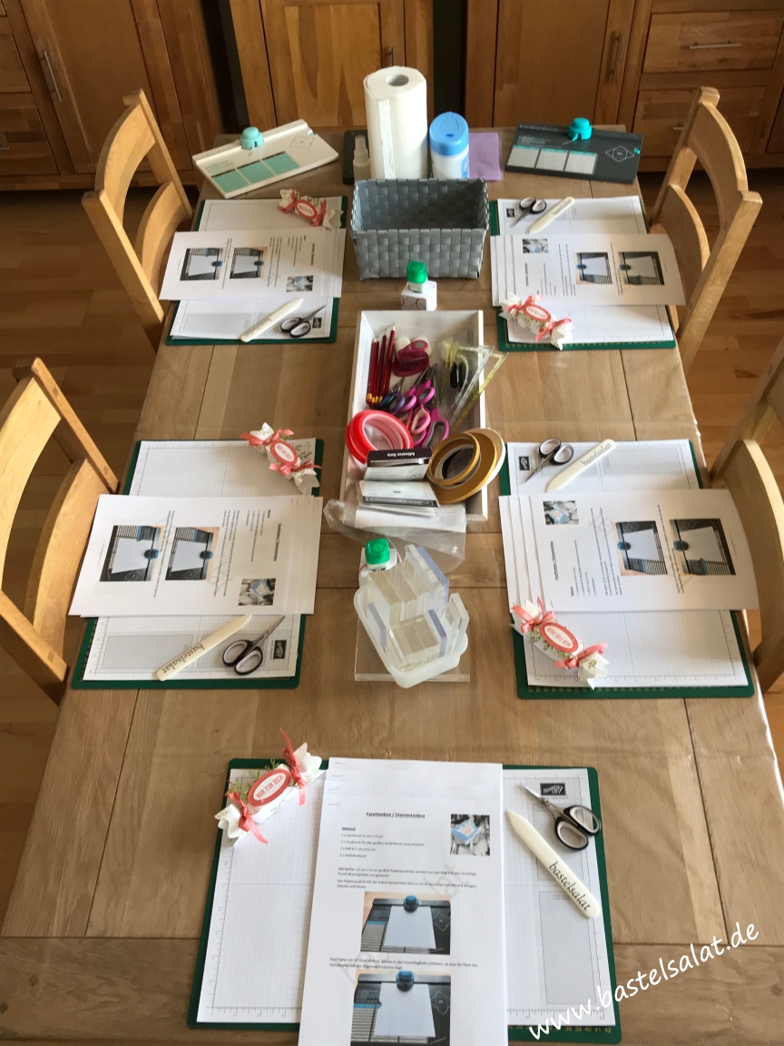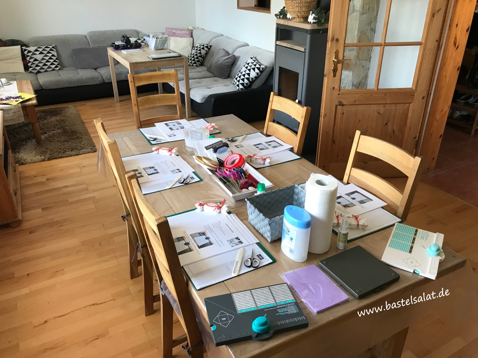 Also bin ich schnell wieder ins Wohnzimmer, den Tisch mit einer Ausziehplatte vergrößert, Anleitungen nochmal ausgedruckt …. Zum Glück hatte ich im Vorfeld schon 1 Goodie mehr gewerkelt 😊, so dass alle ein kleines Begrüßungsgeschenk bekommen haben.