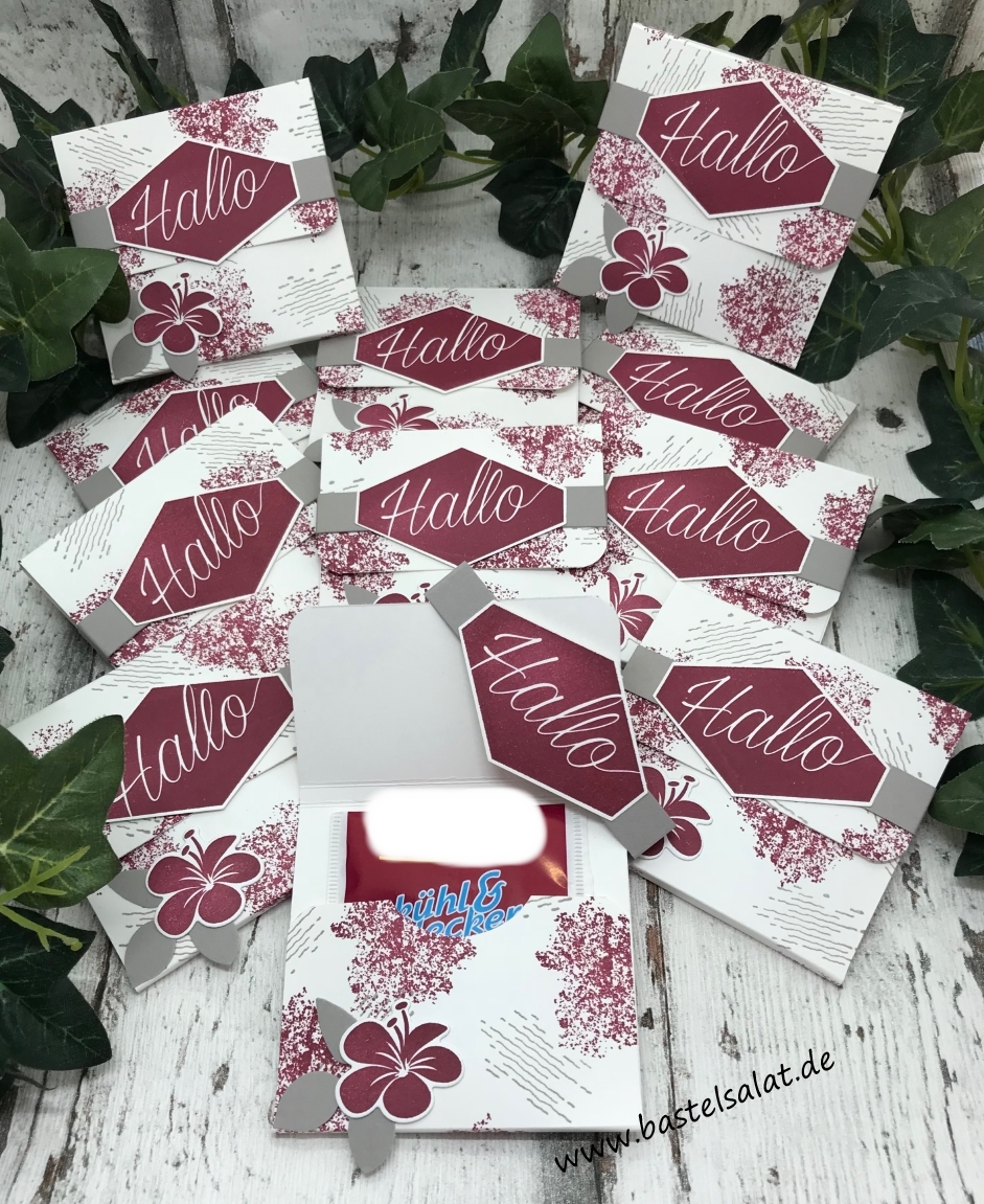 Da ich bei diesen Temperaturen nicht gerne Schokolade verschenke, wurden diese Päckchen mit einem leckeren, erfrischenden Durstlöcher gefüllt.