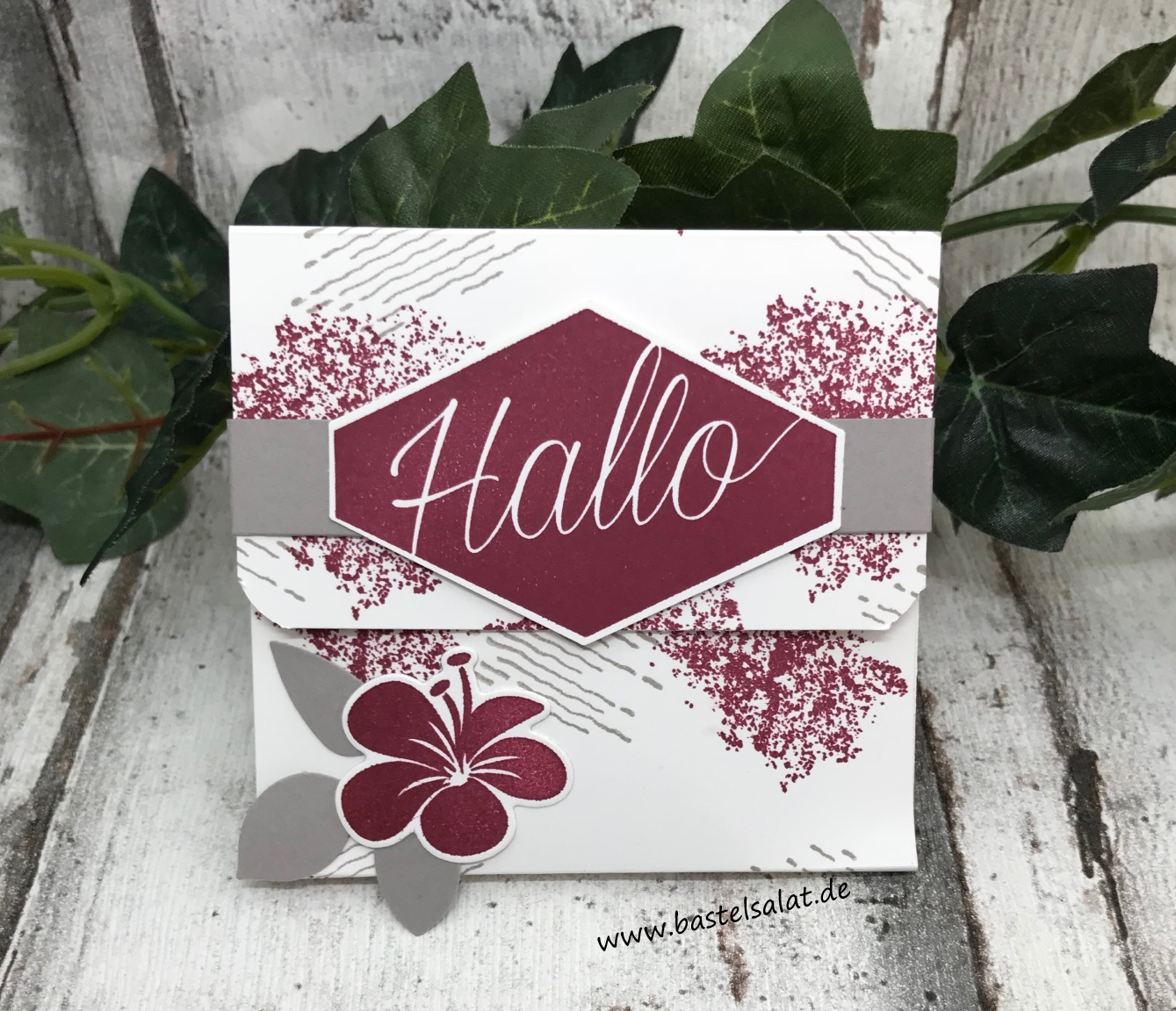 Mit Flüsterweißem Cardstock, welcher mit den Stempelfarben „Merlotrot“ und „Granit“ mit Stempeln aus dem Set „Artisan Textures“ bestempelt wurde, ist diese Verpackung entstanden.